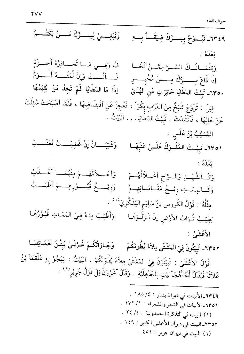 قَوْلُ الأَعْشَى: تَبِيْتُوْنَ فِي المَشْتَى مِلَاءَ بُطُوْنَكُمْ. البَيْتُ: يَهْجُوْ بهِ عَلْقَمَةَ بْنُ عُلَاثَةَ فَيُقَالُ أَنَّهُ أَهْجَا بَيْتٍ لِلجَاهِلَيَّةِ. وَقَالَ آخَرُوْنَ بَلْ قَوْلُ جَرِيْرٍ (¬1):