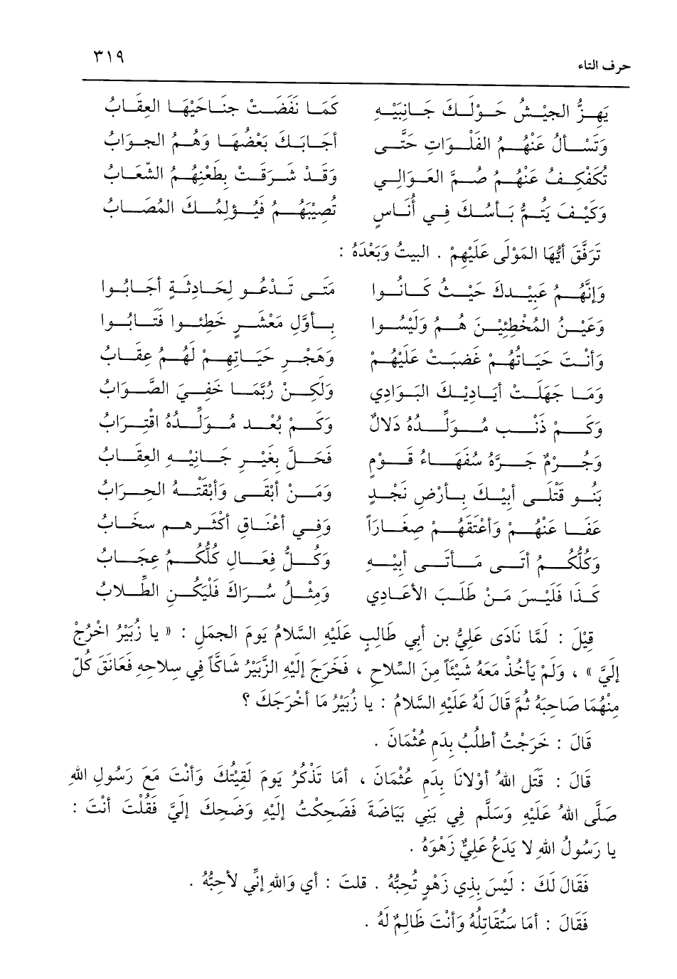 قِيْلَ: لَمَّا نَادَى عَلِيُّ بن أَبِي طَالِبٍ عَلَيْهِ السَّلامُ يَومَ الجمَلِ: "يا زُبَيْرُ اخْرُجْ إلَيَّ"، وَلَمْ يَأخُذْ مَعَهُ شَيْئًا مِنَ السِّلاحِ، فَخَرَجَ إلَيْهِ الزَّبَيْرُ شَاكًّا فِي سِلاحِهِ فَعَانَقَ كُلّ مِنْهُمَا صَاحِبَهُ ثُمَّ قَالَ لَهُ عَلَيْهِ السَّلامُ: يا زُبَيْرُ مَا أخْرَجَكَ؟