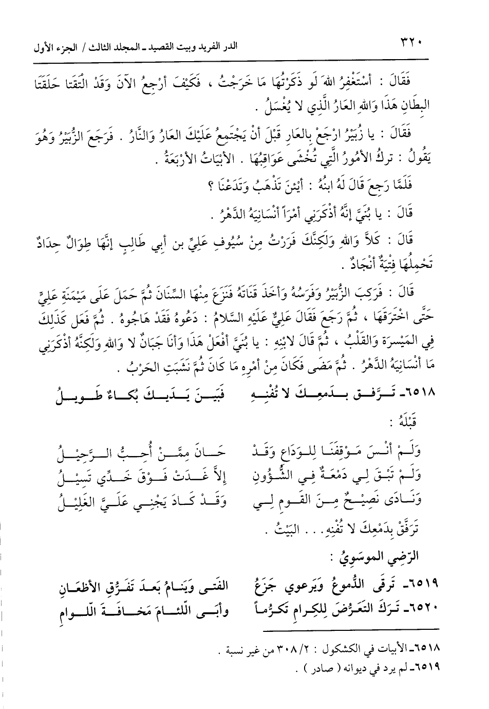 فَقَالَ: يا زُبَيْرُ ارْجَعْ بِالعَارِ قَبْلَ أنْ يَجْتَمِعُ عَلَيْكَ العَارُ وَالنَّارُ. فَرَجَعَ الزُّبَيْرُ وَهُوَ يَقُولُ: تركُ الأمُورُ الَّتِي تُخْشَى عَوَاقِبُهَا. الأبْيَاتُ الأرْبَعَةُ.