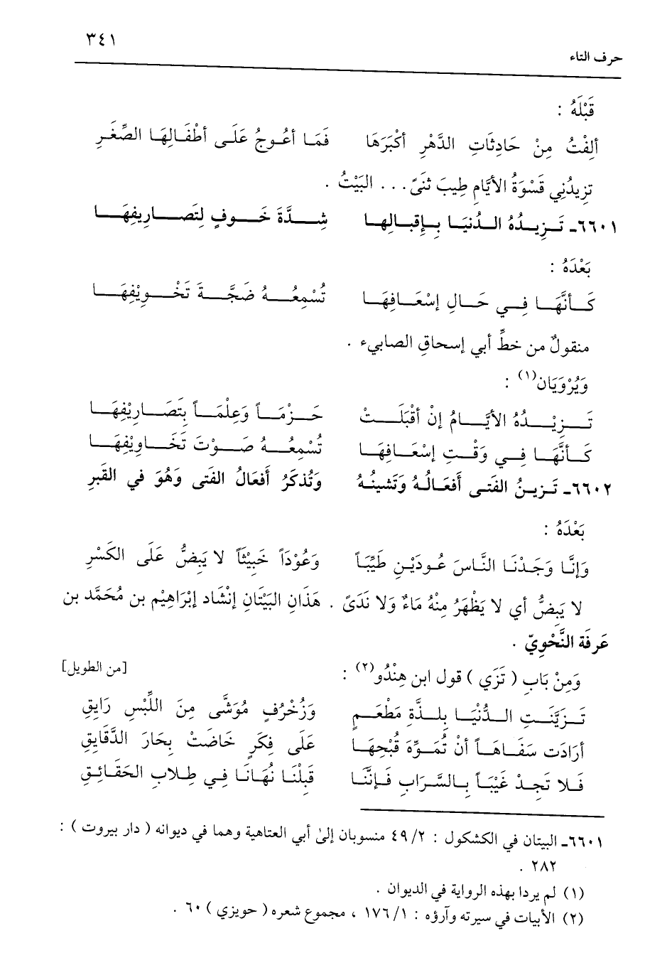 6601 - البيتان في الكشكول: 2/ 49 منسوبان إلى أبي العتاهية وهما في ديوانه (دار بيروت): 282.