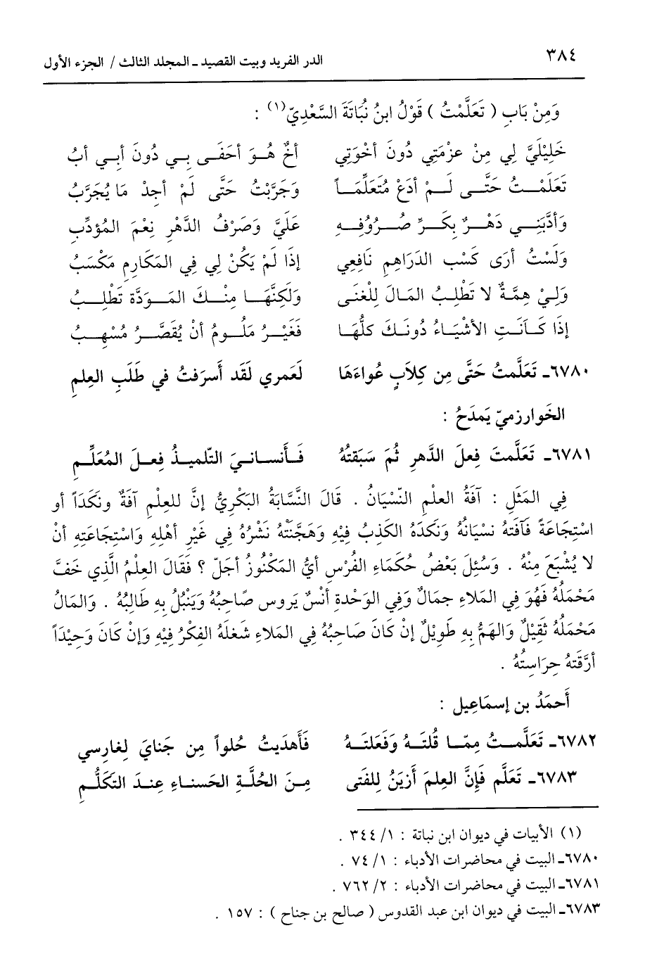 وَمِنْ بَابِ (تَعَلَّمْتُ) قَوْلُ ابْنُ نُبَاتَةَ السَّعْدِيّ (¬1):