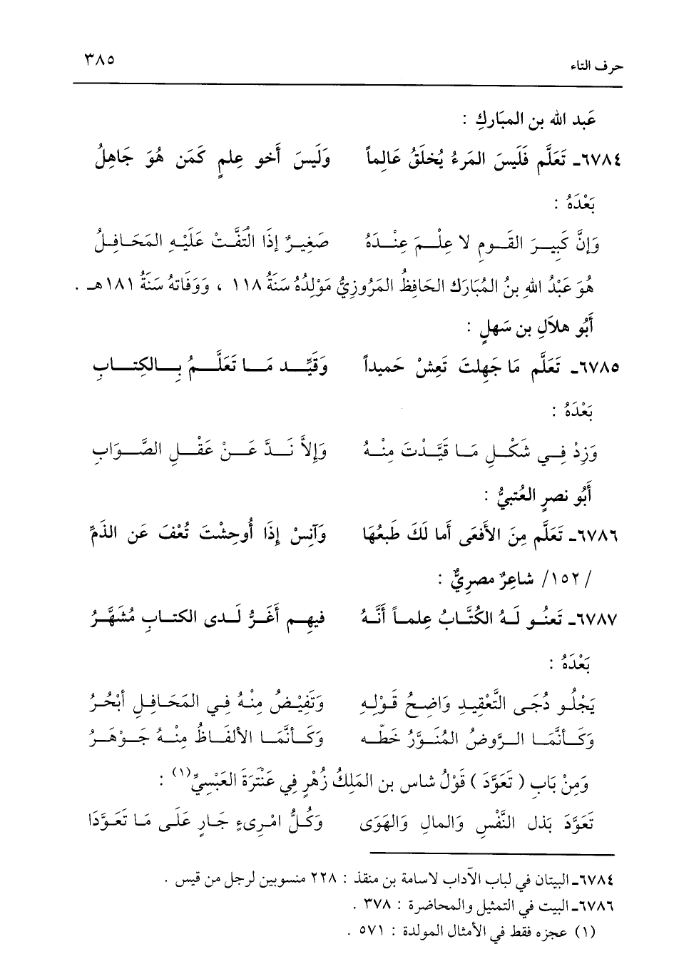 6785 - تَعَلَّم مَا جَهِلتَ تَعِشْ حَميدًا ... وَقَيِّد مَا تَعَلَّمُ بِالكِتابِ