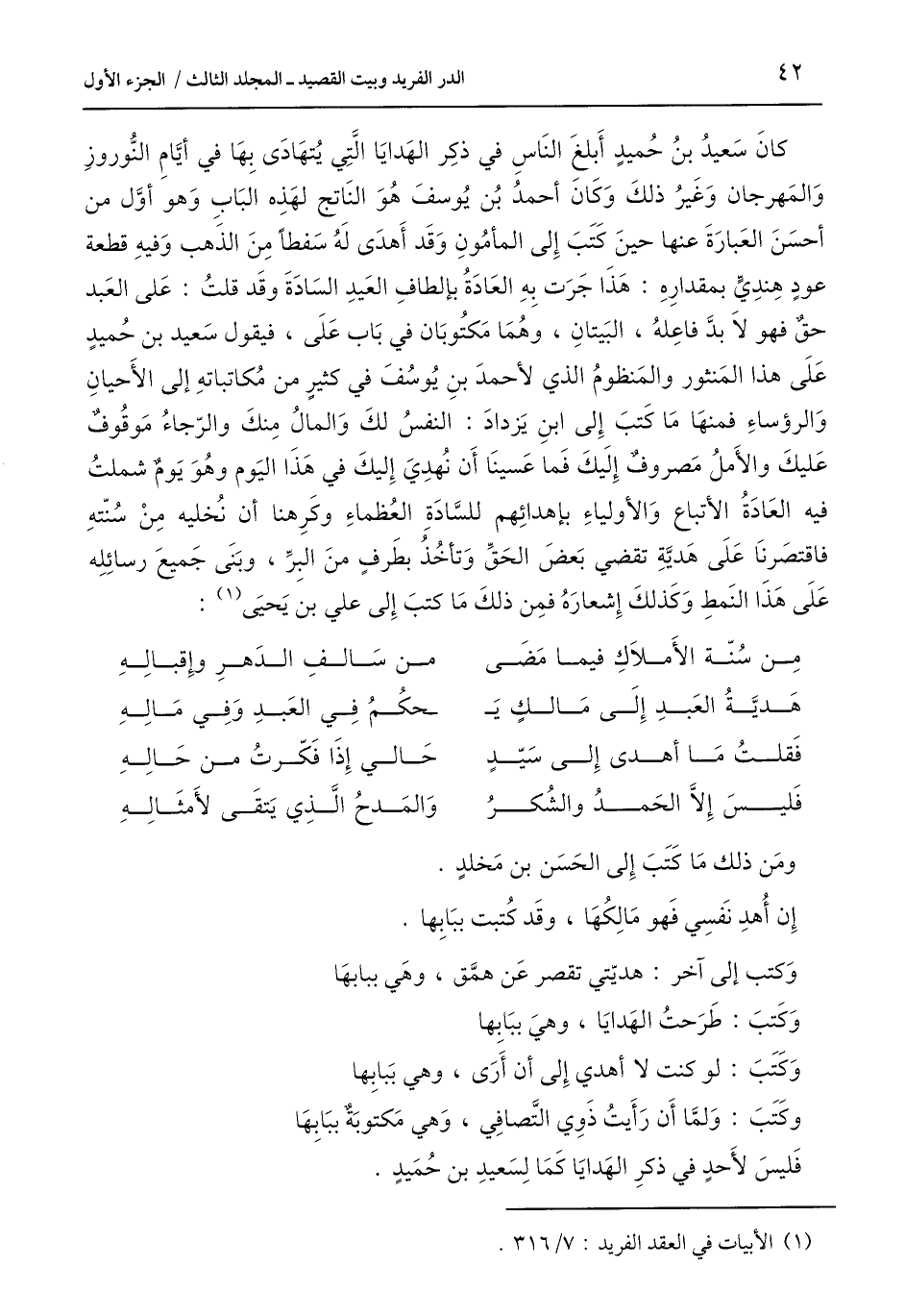 كَانَ سَعيدُ بنُ حُميدٍ أَبلغَ النَّاسِ في ذكِر الهَدايَا الَّتِي يُتهَادَى بِهَا في أيَّام النُّوروزِ وَالمَهرجان وَغَيرُ ذلكَ وَكَانَ أحمدُ بُن يُوسفَ هُوَ النَاتج لهَذِه البَابِ وَهو أوَّل من أحسَنَ العَبارَةَ عنها حينَ كَتَبَ إِلى المأمُونِ وَقَد أَهدَى لَهُ سَفطًا مِنَ الذَهب وَفيهِ قطعة عودٍ هِندِيٍّ بمقدارِهِ: هَذَا جَرَت بِهِ العَادَةُ بإلطافِ العَيدِ السَادَةَ وقَد قلتُ: عَلى العَبد حقٌ فهو لَا بدَّ فاعِلهُ، البَيتانِ، وهُمَا مَكتُوبَان في بَاب عَلَى، فيقول سَعيد بن حُميدٍ عَلَى هذا المَنثور والمَنظومُ الذي لأحمدَ بنِ يُوسُفَ في كثيرٍ من مُكاتباتهِ إلى الأَحيانِ وَالرؤساءِ فمنهَا مَا كَتبَ إِلى ابنِ يَزدادَ: النفسُ لكَ وَالمالُ مِنكَ والرّجاءُ مَوقُوفٌ عَليكَ والأَملُ مَصروفٌ إِلَيكَ فَمَا عَسينَا أَن نُهدِيَ إِليكَ في هَذَا اليَوم وهُوَ يَومٌ شملتُ فيه العَادَةُ الأتباع وَالأولياءِ بإهدائِهم للسَّادَةِ العُظماءِ وكَرِهنا أن نُخليه مِنْ سُنّتهِ فاقتصرنَا عَلَى هَديَّةِ تقضي بَعضَ الحَقِّ وَتأخُذُ بطَرفٍ منَ البِرِّ، وبَنَى جَميعَ رسائِلِه عَلَى هَذَا النَمطِ وَكَذلكَ إِشعارَهُ فمِن ذلكَ مَا كتبَ إِلى علي بن يَحيَى (¬1):