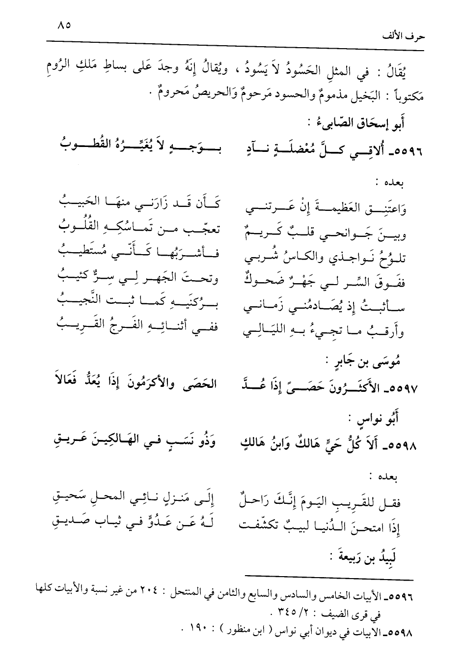 5596 - الأبيات الخامس والسادس والسابع والثامن في المنتحل: 204 من غير نسبة والأبيات كلها في قرى الضيف: 2/ 345.