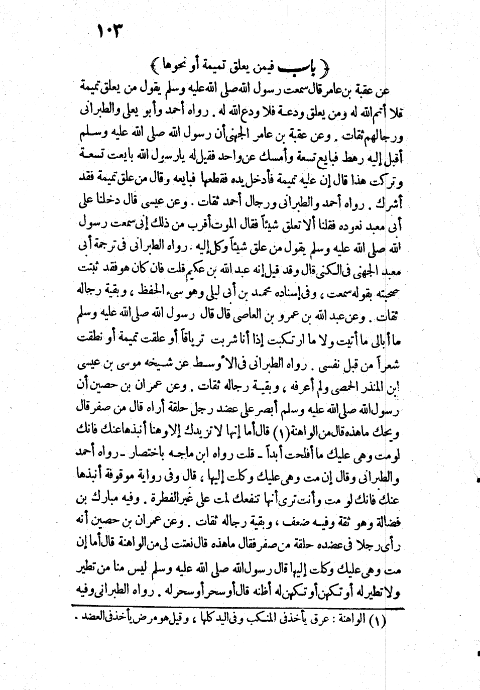 " «مَنْ تَعَلَّقَ تَمِيمَةً فَلَا أَتَمَّ اللَّهُ لَهُ، وَمَنْ يُعَلِّقْ وَدَعَةً فَلَا وَدَعَ اللَّهُ لَهُ» ".