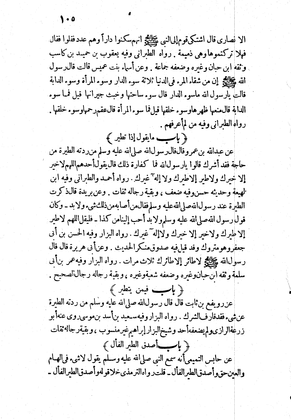 " «مَنْ رَدَّتْهُ الطِّيَرَةُ مِنْ حَاجَةٍ فَقَدْ أَشْرَكَ ". قَالُوا: يَا رَسُولَ اللَّهِ، فَمَا كَفَّارَةُ ذَلِكَ؟ قَالَ: " يَقُولُ أَحَدُهُمْ: اللَّهُمَّ لَا خَيْرَ إِلَّا خَيْرُكَ، وَلَا طَيْرَ إِلَّا طَيْرُكَ، وَلَا إِلَهَ غَيْرُكَ» ".