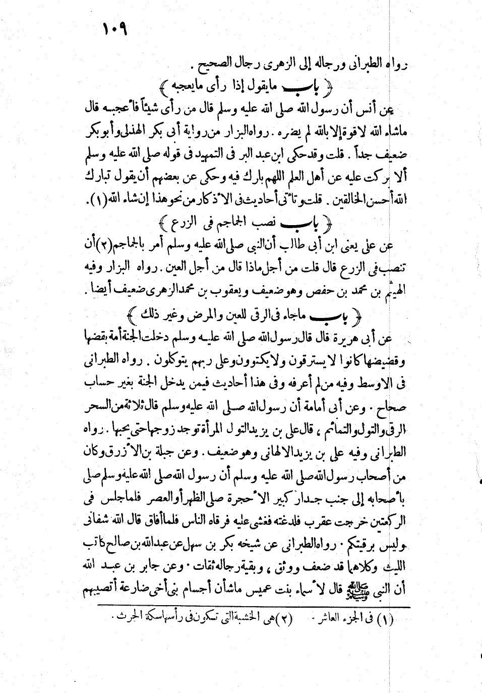 " «ثَلَاثَةٌ مِنَ السِّحْرِ: الرُّقَى، وَالتِّوَلُ، وَالتَّمَائِمُ» ".