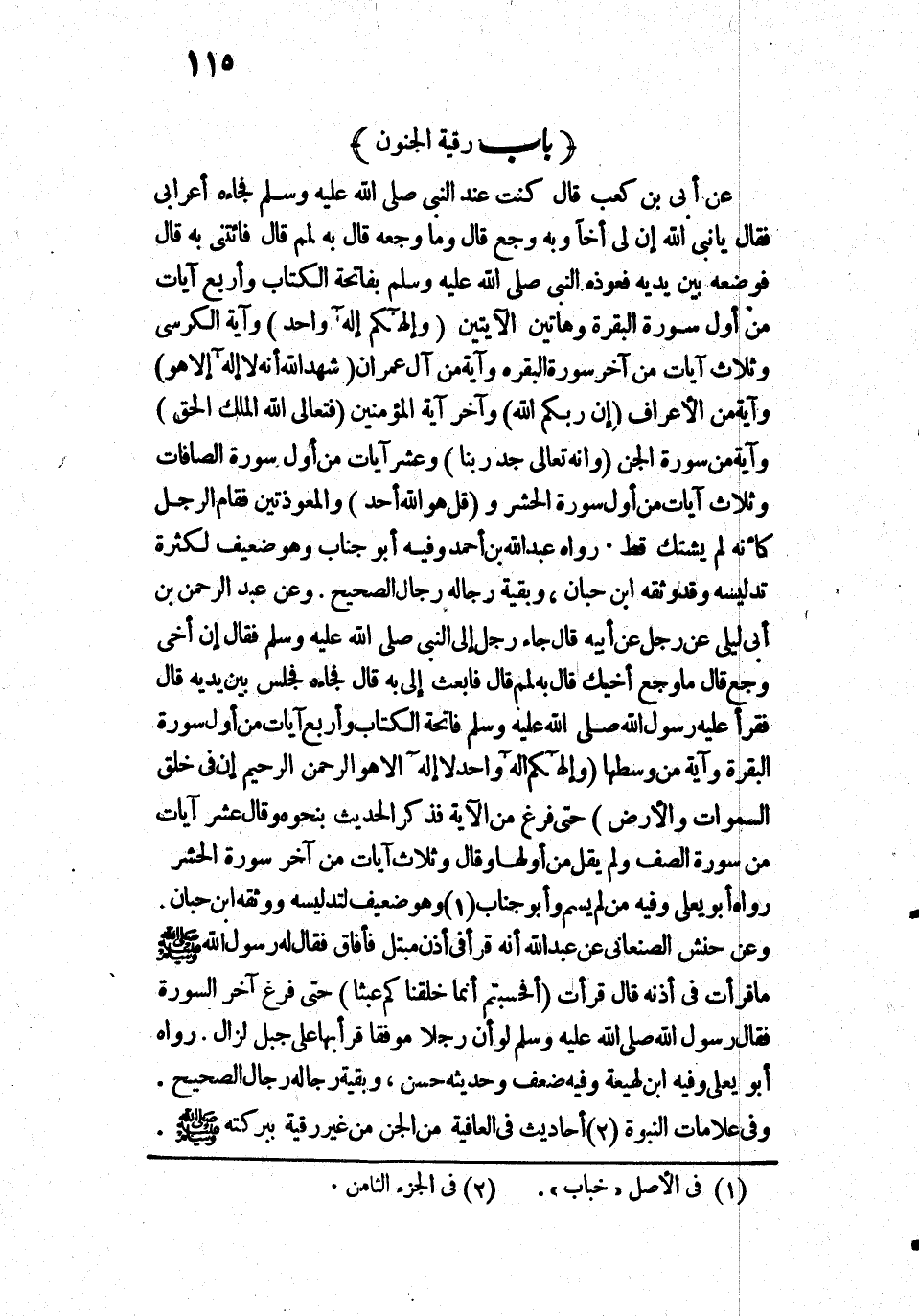 8467 - عَنْ أُبَيِّ بْنِ كَعْبٍ قَالَ: «كُنْتُ عِنْدَ النَّبِيِّ - صَلَّى اللَّهُ عَلَيْهِ وَسَلَّمَ - فَجَاءَهُ أَعْرَابِيٌّ فَقَالَ: يَا نَبِيَّ اللَّهِ إِنَّ لِي أَخًا وَبِهِ وَجَعٌ، قَالَ: " وَمَا وَجَعُهُ؟ " قَالَ: بِهِ لَمَمٌ. قَالَ: " فَأْتِنِي بِهِ " قَالَ: فَوَضَعَهُ بَيْنَ يَدَيْهِ فَعَوَّذَهُ النَّبِيُّ - صَلَّى اللَّهُ عَلَيْهِ وَسَلَّمَ - بِفَاتِحَةِ الْكِتَابِ وَأَرْبَعِ آيَاتٍ مِنْ أَوَّلِ سُورَةِ الْبَقَرَةِ، وَهَاتَيْنِ الْآيَتَيْنِ (وَإِلَهُكُمْ إِلَهٌ وَاحِدٌ)، وَآيَةِ الْكُرْسِيِّ، وَثَلَاثِ آيَاتٍ مِنْ آخِرِ سُورَةِ الْبَقَرَةِ، وَآيَةٍ مِنْ آلِ عِمْرَانَ: {شَهِدَ اللَّهُ أَنَّهُ لَا إِلَهَ إِلَّا هُوَ} [آل عمران: 18]، وَآيَةٍ مِنَ الْأَعْرَافِ: (إِنَّ رَبَّكُمُ اللَّهُ)، وَآخَرِ آيَةِ الْمُؤْمِنِينَ: {فَتَعَالَى اللَّهُ الْمَلِكُ الْحَقُّ} [المؤمنون: 116]، وَآيَةٍ مِنْ سُورَةِ الْجِنِّ: {وَأَنَّهُ تَعَالَى جَدُّ رَبِّنَا} [الجن: 3]، وَعَشْرِ آيَاتٍ مَنْ أَوَّلِ سُورَةِ الصَّافَّاتِ، وَثَلَاثِ آيَاتٍ مَنْ أَوَّلِ سُورَةِ الْحَشْرِ، (وَقُلْ هُوَ اللَّهُ أَحَدٌ)، وَالْمُعَوِّذَتَيْنِ. فَقَامَ الرَّجُلُ كَأَنَّهُ لَمْ يَشْتَكِ قَطُّ».