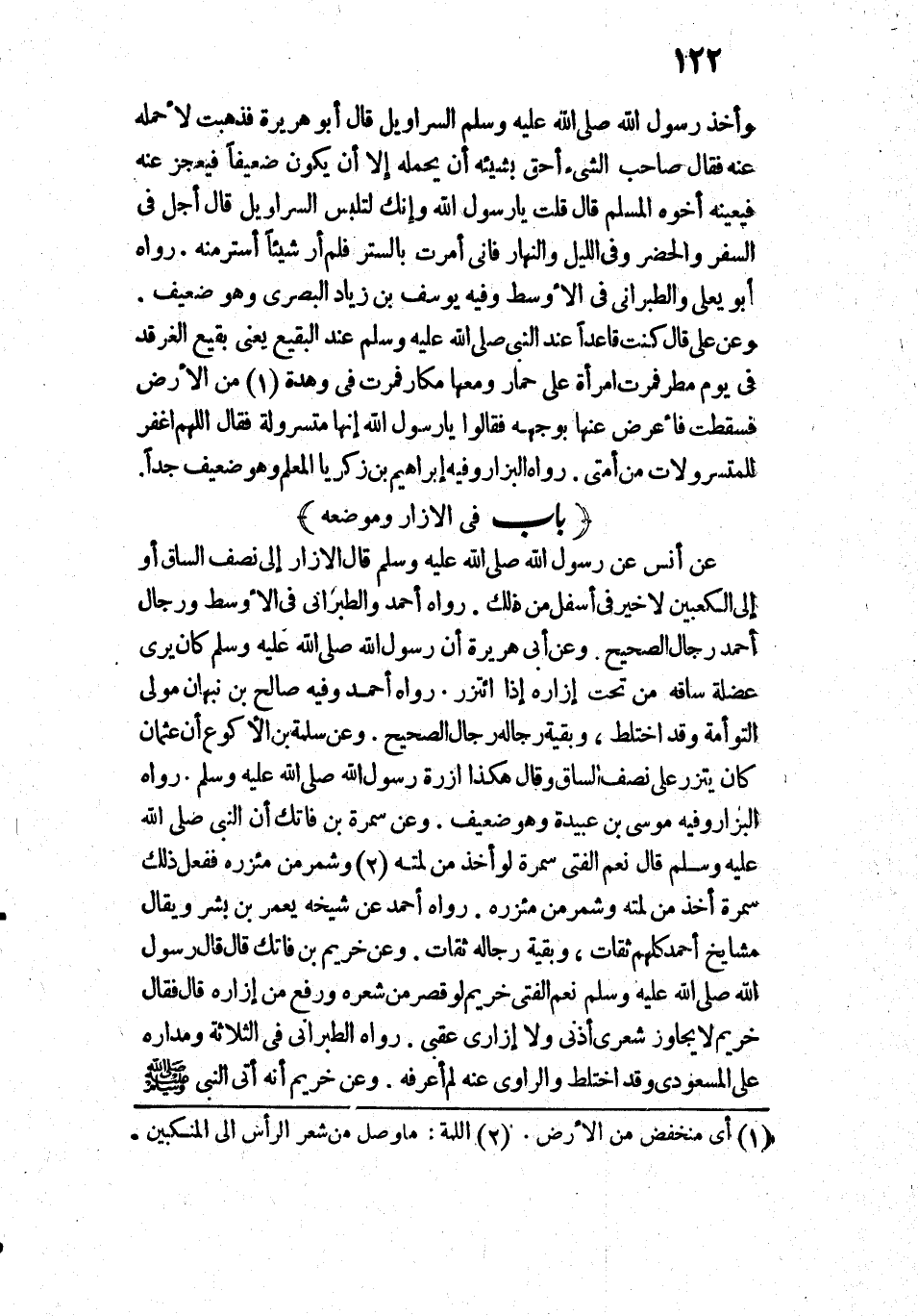 وَأَخَذَ رَسُولُ اللَّهِ - صَلَّى اللَّهُ عَلَيْهِ وَسَلَّمَ - السَّرَاوِيلُ، قَالَ أَبُو هُرَيْرَةَ: فَذَهَبْتُ لِأَحْمِلَهُ عَنْهُ فَقَالَ: " صَاحِبُ الشَّيْءِ أَحَقُّ بِشَيْئِهِ أَنْ يَحْمِلَهُ إِلَّا أَنْ يَكُونَ ضَعِيفًا فَيَعْجِزَ عَنْهُ فَيُعِينُهُ أَخُوهُ الْمُسْلِمُ ". قَالَ: قُلْتُ: يَا رَسُولَ اللَّهِ وَإِنَّكَ لِتَلْبَسُ السَّرَاوِيلَ؟ قَالَ: " أَجَلْ فِي السَّفَرِ وَالْحَضَرِ، وَفِي اللَّيْلِ وَالنَّهَارِ، فَإِنِّي أُمِرْتُ بِالسِّتْرِ فَلَمْ أَجِدْ شَيْئًا أَسْتَرَ مِنْهُ» ".