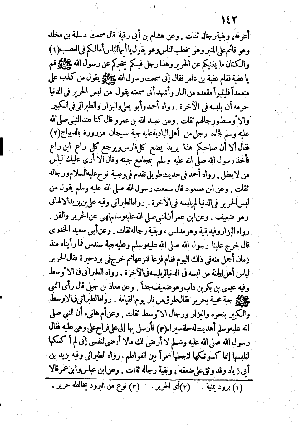 8647 - وَعَنْ هِشَامِ بْنِ أَبِي رُقَيَّةَ قَالَ: سَمِعْتُ مَسْلَمَةَ بْنَ مَخْلَدٍ، وَهُوَ قَائِمٌ عَلَى الْمِنْبَرِ، وَهُوَ يَخْطُبُ النَّاسَ، وَهُوَ يَقُولُ: يَا أَيُّهَا النَّاسُ أَمَا لَكُمْ فِي الْعَصَبِ وَالْكَتَّانِ مَا يُغْنِيكُمْ عَنِ الْحَرِيرِ؟ وَهَذَا رَجُلٌ فِيكُمْ يُخْبِرُكُمْ عَنْ رَسُولِ اللَّهِ - صَلَّى اللَّهُ عَلَيْهِ وَسَلَّمَ - قُمْ يَا عُقْبَةُ، فَقَامَ عُقْبَةُ بْنُ عَامِرٍ [وَأَنَا أَسْمَعُ] فَقَالَ: إِنِّي سَمِعْتُ رَسُولَ اللَّهِ - صَلَّى اللَّهُ عَلَيْهِ وَسَلَّمَ - يَقُولُ: " «مَنْ كَذَبَ عَلَيَّ مُتَعَمِّدًا فَلْيَتَبَوَّأْ مَقْعَدَهُ مِنَ النَّارِ ". وَأَشْهَدُ أَنِّي سَمِعْتُهُ يَقُولُ: " مَنْ لَبِسَ الْحَرِيرَ فِي الدُّنْيَا حُرِمَهُ أَنْ يَلْبَسَهُ فِي الْآخِرَةِ» ".