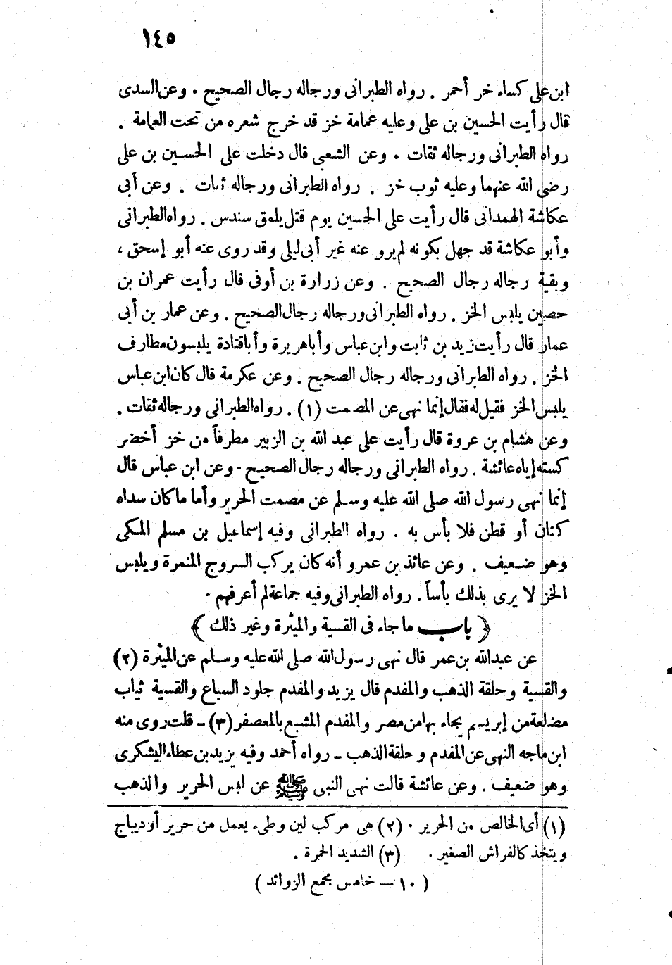 8672 - وَعَنِ الشَّعْبِيِّ قَالَ: دَخَلْتُ عَلَى الْحُسَيْنِ بْنِ عَلِيٍّ - رَضِيَ اللَّهُ عَنْهُمَا وَعَلَيْهِ ثَوْبُ خَزٍّ.