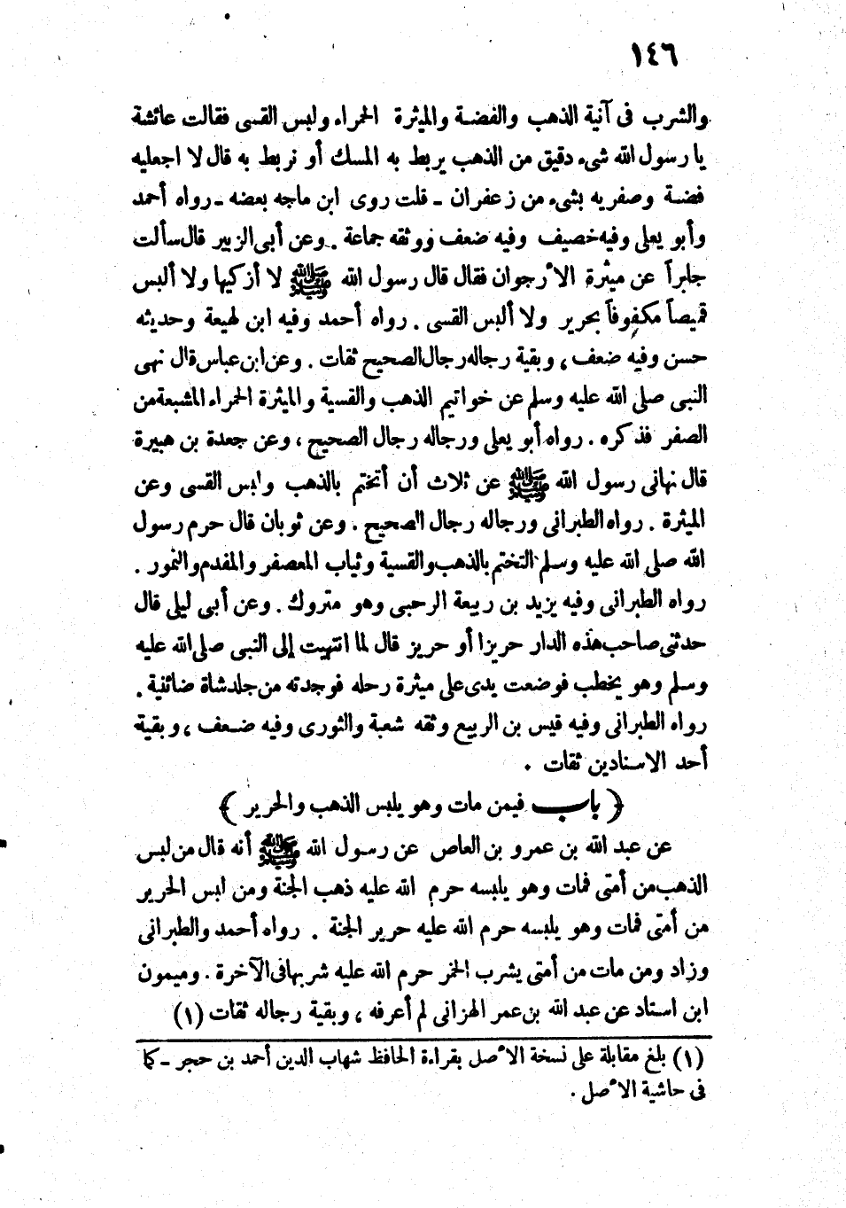 وَالشُّرْبِ فِي آنِيَةِ الذَّهَبِ وَالْفِضَّةِ، وَالْمِيثَرَةِ الْحَمْرَاءِ، وَلُبْسُ الْقَسِّيِّ.