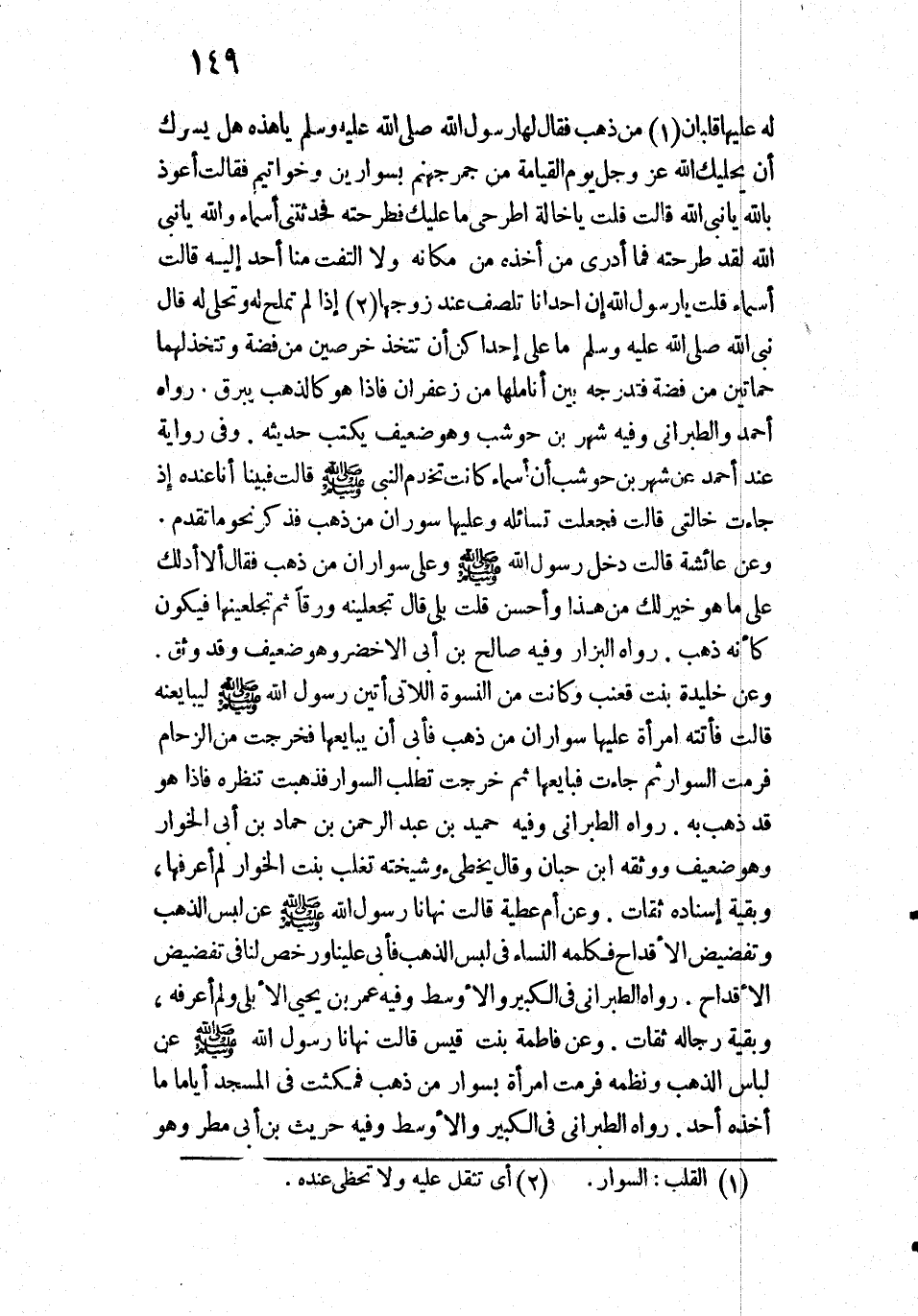 قَالَتْ أَسْمَاءُ: قُلْتُ: يَا رَسُولَ اللَّهِ، إِنَّ إِحْدَانَا تَصْلَفُ عِنْدَ زَوْجِهَا إِذَا لَمْ تُمَلَّحْ لَهُ وَتُحَلَّى لَهُ؟ قَالَ نَبِيَّ اللَّهِ - صَلَّى اللَّهُ عَلَيْهِ وَسَلَّمَ -: " مَا عَلَى إِحْدَاكُنَّ أَنْ تَتَّخِذَ خُرْصَيْنِ مِنْ فِضَّةٍ وَتَتَّخِذَ لَهُمَا جُمَانَتَيْنِ مِنْ فِضَّةٍ، فَتُدْرِجُهُ بَيْنَ أَنَامِلِهَا مِنْ زَعْفَرَانٍ فَإِذَا هُوَ كَالذَّهَبِ يَبْرُقُ» ".