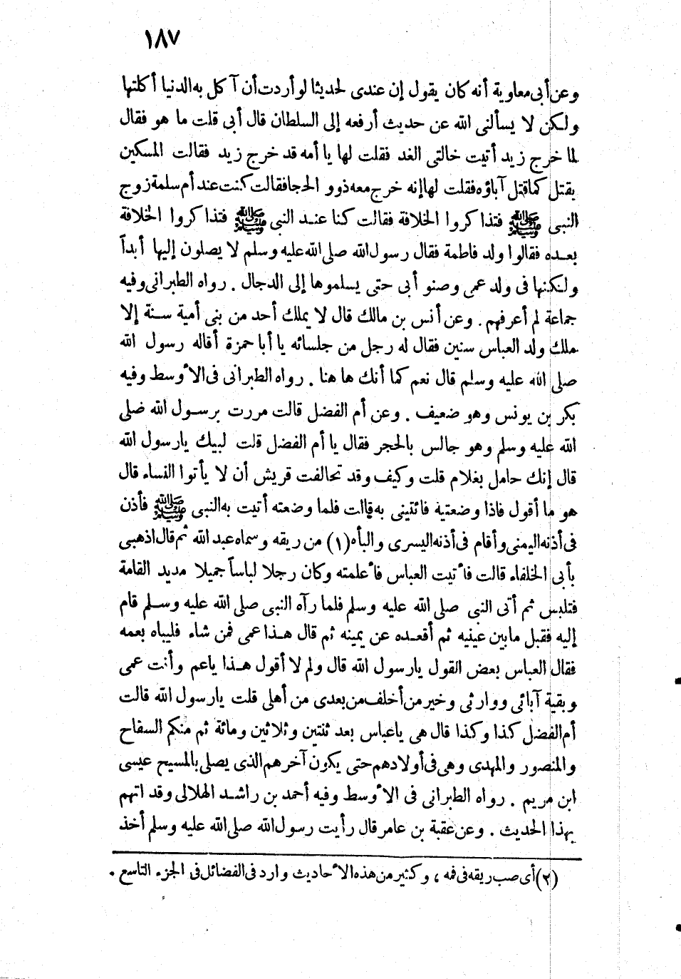 8956 - وَعَنْ أُمِّ الْفَضْلِ قَالَتْ: «مَرَرْتُ بِرَسُولِ اللَّهِ - صَلَّى اللَّهُ عَلَيْهِ وَسَلَّمَ - وَهُوَ جَالِسٌ بِالْحِجْرِ فَقَالَ: " يَا أُمَّ الْفَضْلِ " قُلْتُ: لَبَّيْكَ يَا رَسُولَ اللَّهِ قَالَ: " إِنَّكِ حَامِلٌ بِغُلَامٍ " قُلْتُ: وَكَيْفَ وَقَدْ تَحَالَفَتْ قُرَيْشٌ أَنْ لَا يَأْتُوا النِّسَاءَ؟ قَالَ: " هُوَ مَا أَقُولُ فَإِذَا وَضَعْتِيهِ فَائْتِينِي بِهِ " قَالَتْ: فَلَمَّا وَضَعْتُهُ أَتَيْتُ بِهِ النَّبِيَّ - صَلَّى اللَّهُ عَلَيْهِ وَسَلَّمَ - فَأَذَّنَ فِي أُذُنِهِ الْيُمْنَى وَأَقَامَ فِي أُذُنِهِ الْيُسْرَى، وَأَلْبَأَهُ مِنْ رِيقِهِ وَسَمَّاهُ عَبْدَ اللَّهِ، ثُمَّ قَالَ: " اذْهَبِي بِأَبِي الْخُلَفَاءِ " قَالَتْ: فَأَتَيْتُ الْعَبَّاسَ فَأَعْلَمْتُهُ، وَكَانَ رَجُلًا لَبَّاسًا جَمِيلًا مَدِيدَ الْقَامَةِ فَتَلَبَّسَ، ثُمَّ أَتَى النَّبِيَّ - صَلَّى اللَّهُ عَلَيْهِ وَسَلَّمَ -، فَلَمَّا رَآهُ النَّبِيُّ - صَلَّى اللَّهُ عَلَيْهِ وَسَلَّمَ -، قَامَ إِلَيْهِ فَقَبَّلَ مَا بَيْنَ عَيْنَيْهِ ثُمَّ أَقْعَدَهُ عَنْ يَمِينِهِ ثُمَّ قَالَ: " هَذَا عَمِّيَ فَمَنْ شَاءَ فَلْيُبَاهِ بِعَمِّهِ ". فَقَالَ الْعَبَّاسُ: بَعْضُ الْقَوْلِ يَا رَسُولَ اللَّهِ. قَالَ: " وَلِمَ لَا أَقُولُ هَذَا يَا عَمُّ وَأَنْتَ عَمِّي وَبَقِيَّةُ آبَائِي وَوَارِثِي، وَخَيْرُ مَنْ أَخْلُفُ مِنْ بَعْدِي مِنْ أَهْلِي؟! " قُلْتُ: يَا رَسُولَ اللَّهِ قَالَتْ أُمُّ الْفَضْلِ كَذَا وَكَذَا. قَالَ: " هِيَ يَا عَبَّاسُ بَعْدَ ثِنْتَيْنِ وَثَلَاثِينَ وَمِائَةٍ، ثُمَّ مِنْكُمُ السَّفَّاحُ وَالْمَنْصُورُ وَالْمَهْدِيُّ، وَهِيَ فِي أَوْلَادِهِمْ حَتَّى يَكُونَ آخِرُهُمِ الَّذِي يُصَلِّي بِالْمَسِيحِ عِيسَى ابْنِ مَرْيَمَ».