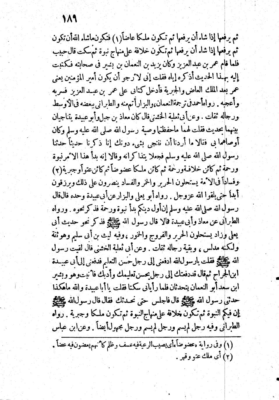 فَأَتَيْتُ وَهُوَ وَبَشِيرُ بْنُ سَعْدٍ أَبُو النُّعْمَانِ يَتَحَدَّثَانِ فَلَمَّا رَأَيَانِي سَكَتَا فَقُلْتُ: يَا أَبَا عُبَيْدَةَ وَاللَّهِ مَا هَكَذَا حَدَّثَنِي رَسُولُ اللَّهِ - صَلَّى اللَّهُ عَلَيْهِ وَسَلَّمَ - قَالَ: فَاجْلِسْ حَتَّى نُحَدِّثَكَ فَقَالَ: قَالَ رَسُولُ اللَّهِ - صَلَّى اللَّهُ عَلَيْهِ وَسَلَّمَ -: " إِنَّ فِيكُمُ النُّبُوَّةَ ثُمَّ تَكُونُ خِلَافَةً عَلَى مِنْهَاجِ النُّبُوَّةِ ثُمَّ تَكُونُ مُلْكًا وَجَبْرِيَّةً».