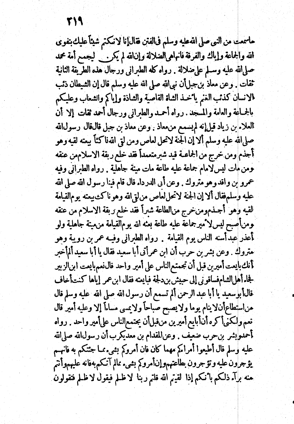 مَا سَمِعْتَ مِنَ النَّبِيِّ - صَلَّى اللَّهُ عَلَيْهِ وَسَلَّمَ - فِي الْفِتَنِ؟ فَقَالَ: إِنَّا لَا نَكْتُمُ شَيْئًا، عَلَيْكَ بِتَقْوَى اللَّهِ وَالْجَمَاعَةِ، وَإِيَّاكَ وَالْفُرْقَةَ فَإِنَّهَا هِيَ الضَّلَالَةُ، وَإِنَّ اللَّهَ لَمْ يَكُنْ لِيَجْمَعَ أُمَّةَ مُحَمَّدٍ - صَلَّى اللَّهُ عَلَيْهِ وَسَلَّمَ - عَلَى ضَلَالَةٍ.