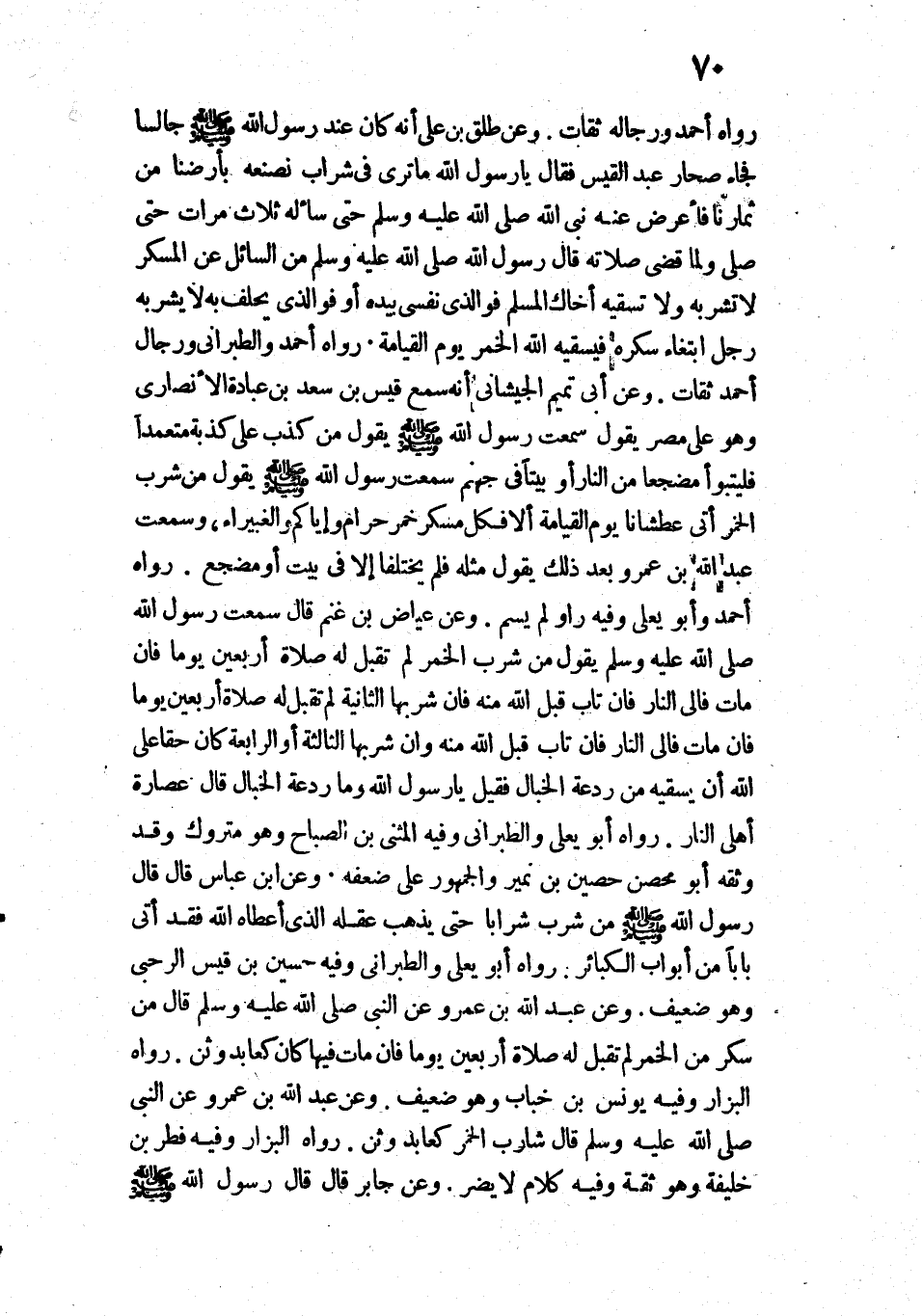 8182 - وَعَنْ طَلْقِ بْنِ عَلِيٍّ «أَنَّهُ كَانَ عِنْدَ رَسُولِ اللَّهِ - صَلَّى اللَّهُ عَلَيْهِ وَسَلَّمَ - جَالِسًا فَجَاءَ صُحَارُ عَبَدِ الْقَيْسِ فَقَالَ: يَا رَسُولَ اللَّهِ مَا تَرَى فِي شَرَابٍ نَصْنَعُهُ بِأَرْضِنَا مِنْ ثِمَارِنَا؟ فَأَعْرَضَ عَنْهُ نَبِيُّ اللَّهِ - صَلَّى اللَّهُ عَلَيْهِ وَسَلَّمَ - حَتَّى سَأَلَهُ ثَلَاثَ مَرَّاتٍ حَتَّى صَلَّى، وَلَمَّا قَضَى صَلَاتَهُ قَالَ رَسُولُ اللَّهِ - صَلَّى اللَّهُ عَلَيْهِ وَسَلَّمَ -: " مَنِ السَّائِلُ عَنِ الْمُسْكِرِ؟ لَا تَشْرَبْهُ، وَلَا تَسْقِهِ أَخَاكَ الْمُسْلِمَ، فَوَالَّذِي نَفْسِي بِيَدِهِ - أَوْ فَوَالَّذِي يُحْلَفُ بِهِ - لَا يَشْرَبُهُ رَجُلٌ ابْتِغَاءَ لَذَّةِ سُكْرِهِ، فَيَسْقِيهِ اللَّهُ الْخَمْرَ يَوْمَ الْقِيَامَةِ».