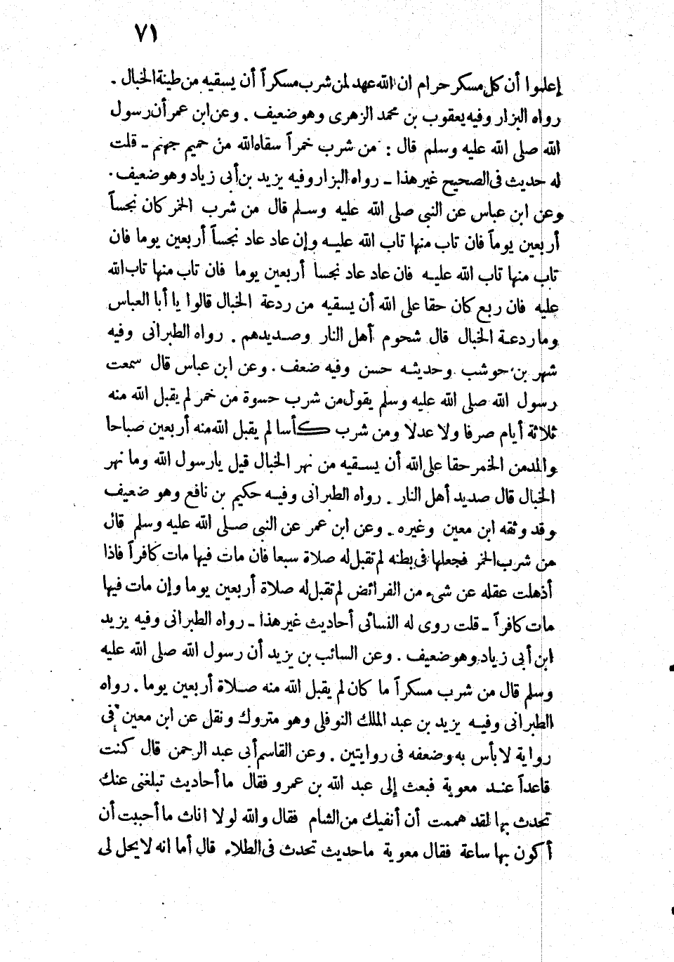 " «اعْلَمُوا أَنَّ كُلَّ مُسْكِرٍ حَرَامٌ، إِنَّ اللَّهَ عَهِدَ لِمَنْ شَرِبَ مُسْكِرًا أَنْ يَسْقِيَهُ مِنْ طِينَةِ الْخَبَالِ» ".