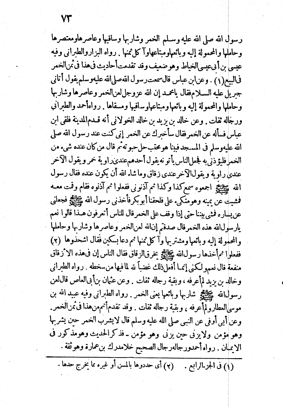 8203 - وَعَنْ خَالِدِ بْنِ يَزِيدَ «عَنْ ثَابِتِ بْنِ زَيْدِ الْخَوْلَانِيِّ أَنَّهُ قَدِمَ الْمَدِينَةَ فَلَقِيَ ابْنَ عَبَّاسٍ فَسَأَلَهُ عَنِ الْخَمْرِ، فَقَالَ: سَأُخْبِرُكَ عَنِ الْخَمْرِ، إِنِّي كُنْتُ عِنْدَ رَسُولِ اللَّهِ - صَلَّى اللَّهُ عَلَيْهِ وَسَلَّمَ - فِي الْمَسْجِدِ فَبَيْنَا هُوَ مُحْتَبٍ حَلَّ حَبْوَتَهُ، ثُمَّ قَالَ: " مَنْ كَانَ عِنْدَهُ شَيْءٌ مِنَ الْخَمْرِ فَلْيُؤْذِنِّي بِهِ ". فَجَعَلَ النَّاسُ يَأْتُونَهُ، يَقُولُ أَحَدُهُمْ: عِنْدِي رَاوِيَةُ خَمْرٍ، وَيَقُولُ الْآخَرُ: عِنْدِي رِوَايَةٌ، وَيَقُولُ الْآخَرُ: عِنْدِي زِقَاقٌ، وَمَا شَاءَ اللَّهُ أَنْ يَكُونَ عِنْدَهُ، فَقَالَ رَسُولُ اللَّهِ - صَلَّى اللَّهُ عَلَيْهِ وَسَلَّمَ -: " اجْمَعُوهُ، بِبَقِيعِ كَذَا وَكَذَا، ثُمَّ آذِنُونِي " فَفَعَلُوا، ثُمَّ آذَنُوهُ فَقَامَ وَقُمْتُ مَعَهُ، فَمَشَيْتُ عَنْ يَمِينِهِ وَهُوَ مُتَّكِئٌ عَلَيَّ، فَلَحِقَنَا أَبُو بَكْرٍ فَأَخَذَنِي رَسُولُ اللَّهِ - صَلَّى اللَّهُ عَلَيْهِ وَسَلَّمَ - فَجَعَلَنِي عَنْ يَسَارِهِ، وَجَعَلَ أَبَا بَكْرٍ مَكَانِي، ثُمَّ لَحِقَنَا عُمَرُ بْنُ الْخَطَّابِ فَأَخَذَهُ فَجَعَلَهُ عَنْ يَسَارِهِ فَمَشَى بَيْنَنَا حَتَّى إِذَا وَقَفَ عَلَى الْخَمْرِ، قَالَ لِلنَّاسِ: " أَتَعْرِفُونَ هَذَا؟ " قَالُوا: نَعَمْ يَا رَسُولَ اللَّهِ هَذِهِ الْخَمْرُ، قَالَ: " صَدَقْتُمْ إِنَّ اللَّهَ لَعَنَ الْخَمْرَ، وَعَاصِرَهَا، [وَمُعْتَصِرَهَا]، وَشَارِبَهَا، [وَسَاقِيَهَا]، وَحَامِلَهَا، وَالْمَحْمُولَةَ إِلَيْهِ، وَبَائِعَهَا، وَمُشْتَرِيَهَا، وَآكِلَ ثَمَنِهَا " ثُمَّ دَعَا بِسِكِّينٍ فَقَالَ: " اشْحَذُوهَا " فَفَعَلُوا، ثُمَّ أَخَذَهَا رَسُولُ اللَّهِ - صَلَّى اللَّهُ عَلَيْهِ وَسَلَّمَ - يُخَرِّقُ الزِّقَاقَ فَقَالَ النَّاسُ: إِنَّ فِي هَذِهِ الْأَزْقَاقِ مَنْفَعَةً؟! قَالَ: " نَعَمْ، وَلَكِنِّي إِنَّمَا أَفْعَلُ ذَلِكَ غَضَبًا لِلَّهِ لِمَا فِيهَا مِنْ سَخَطِهِ».
