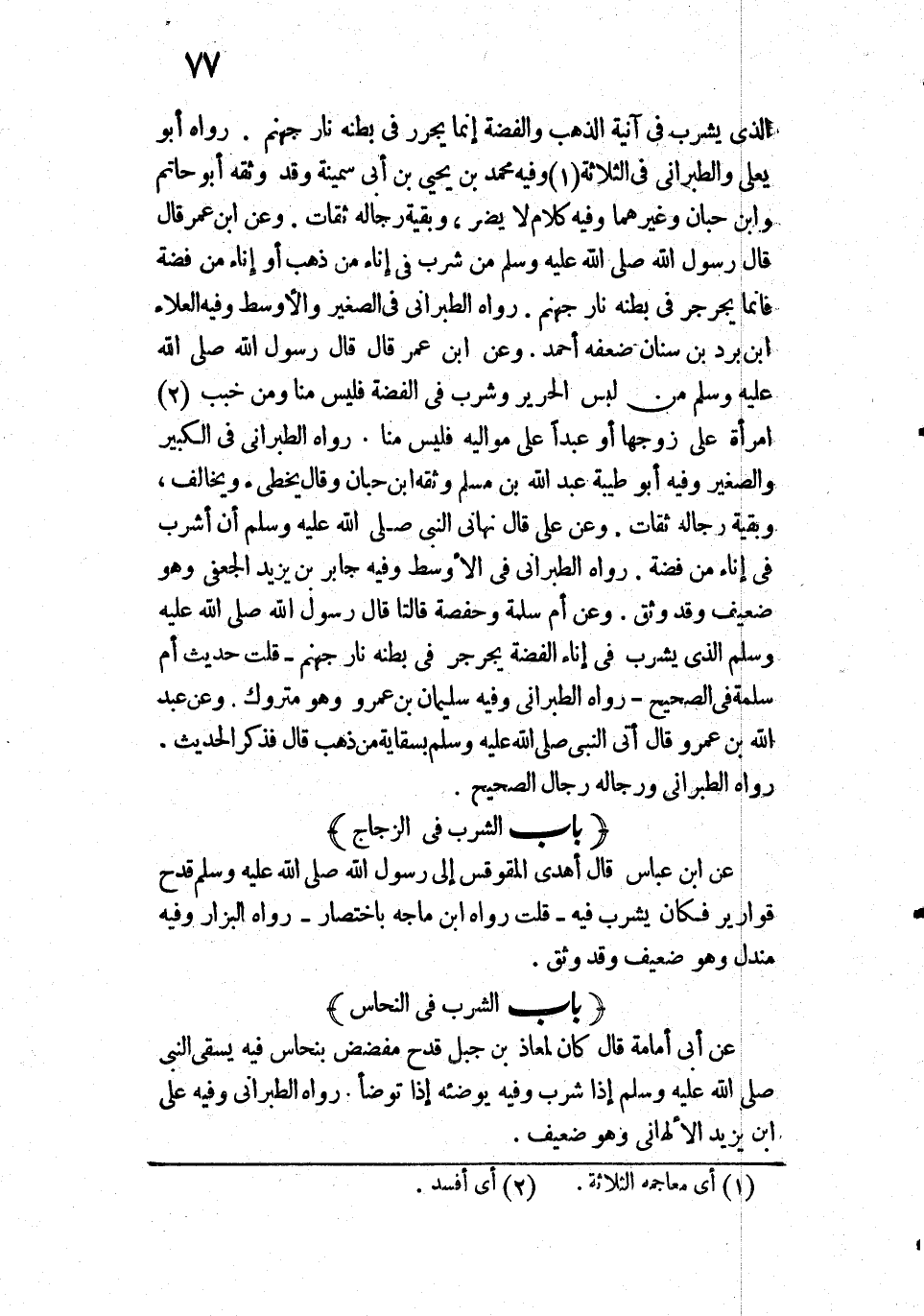 الَّذِي يَشْرَبُ فِي آنِيَةِ الذَّهَبِ وَالْفِضَّةِ إِنَّمَا يُجَرْجِرُ فِي بَطْنِهِ نَارَ جَهَنَّمَ» ".