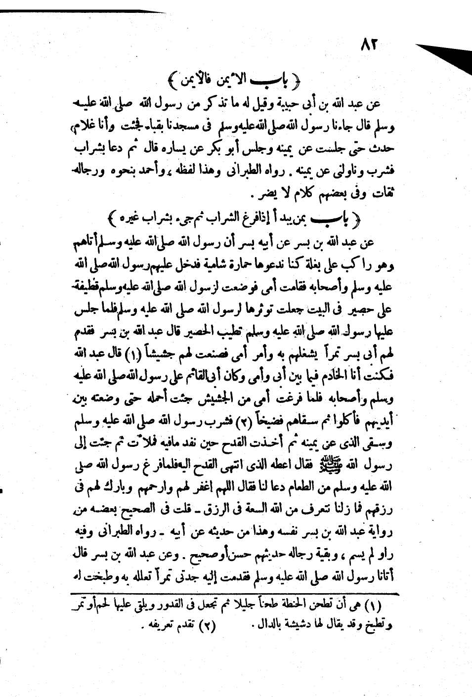 8265 - «عَنْ عَبْدِ اللَّهِ بْنِ أَبِي حَبِيبَةَ وَقِيلَ لَهُ: مَا تَذْكُرُ مِنْ رَسُولِ اللَّهِ - صَلَّى اللَّهُ عَلَيْهِ وَسَلَّمَ -؟ قَالَ: جَاءَنَا رَسُولُ اللَّهِ - صَلَّى اللَّهُ عَلَيْهِ وَسَلَّمَ - فِي مَسْجِدِنَا بِقُبَاءَ، فَجِئْتُ وَأَنَا غُلَامٌ حَدَثٌ حَتَّى جَلَسْتُ عَنْ يَمِينِهِ، وَجَلَسَ أَبُو بَكْرٍ عَنْ يَسَارِهِ. قَالَ: ثُمَّ دَعَا بِشَرَابٍ، فَشَرِبَ وَنَاوَلَنِي عَنْ يَمِينِهِ».