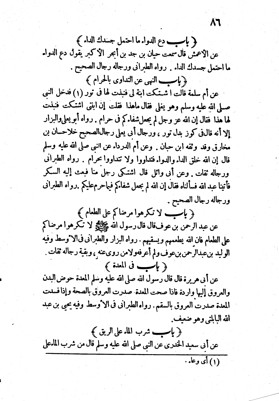 " «إِنَّ اللَّهَ خَلَقَ الدَّاءَ وَالدَّوَاءَ، فَتَدَاوُوا، وَلَا تَتَدَاوُوا بِحَرَامٍ» ".