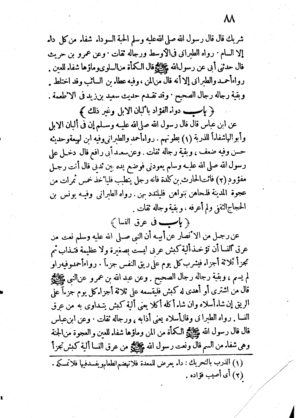 «قَالَ رَسُولُ اللَّهِ - صَلَّى اللَّهُ عَلَيْهِ وَسَلَّمَ -: " الْكَمْأَةُ مِنَ الْمَنِّ، وَمَاؤُهَا شِفَاءٌ لِلْعَيْنِ، وَالْعَجْوَةُ مِنَ الْجَنَّةِ، وَهِيَ شِفَاءٌ مِنَ السُّمِّ ".