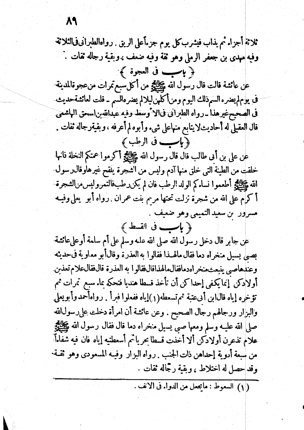 " «مَنْ أَكَلَ سَبْعَ تَمَرَاتٍ مِنْ عَجْوَةِ الْمَدِينَةِ فِي يَوْمٍ لَمْ يَضُرُّهُ السُّمُّ ذَلِكَ الْيَوْمَ، وَمَنْ أَكَلَهُنَّ لَيْلًا لَمْ يَضُرُّهُ السُّمُّ» ".