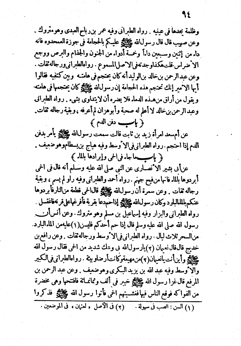 " مَنْ أَرَاقَ مِنْ هَذِهِ الدِّمَاءِ فَلَا يَضُرُّهُ أَنْ لَا يَتَدَاوَى بِشَيْءٍ» ".