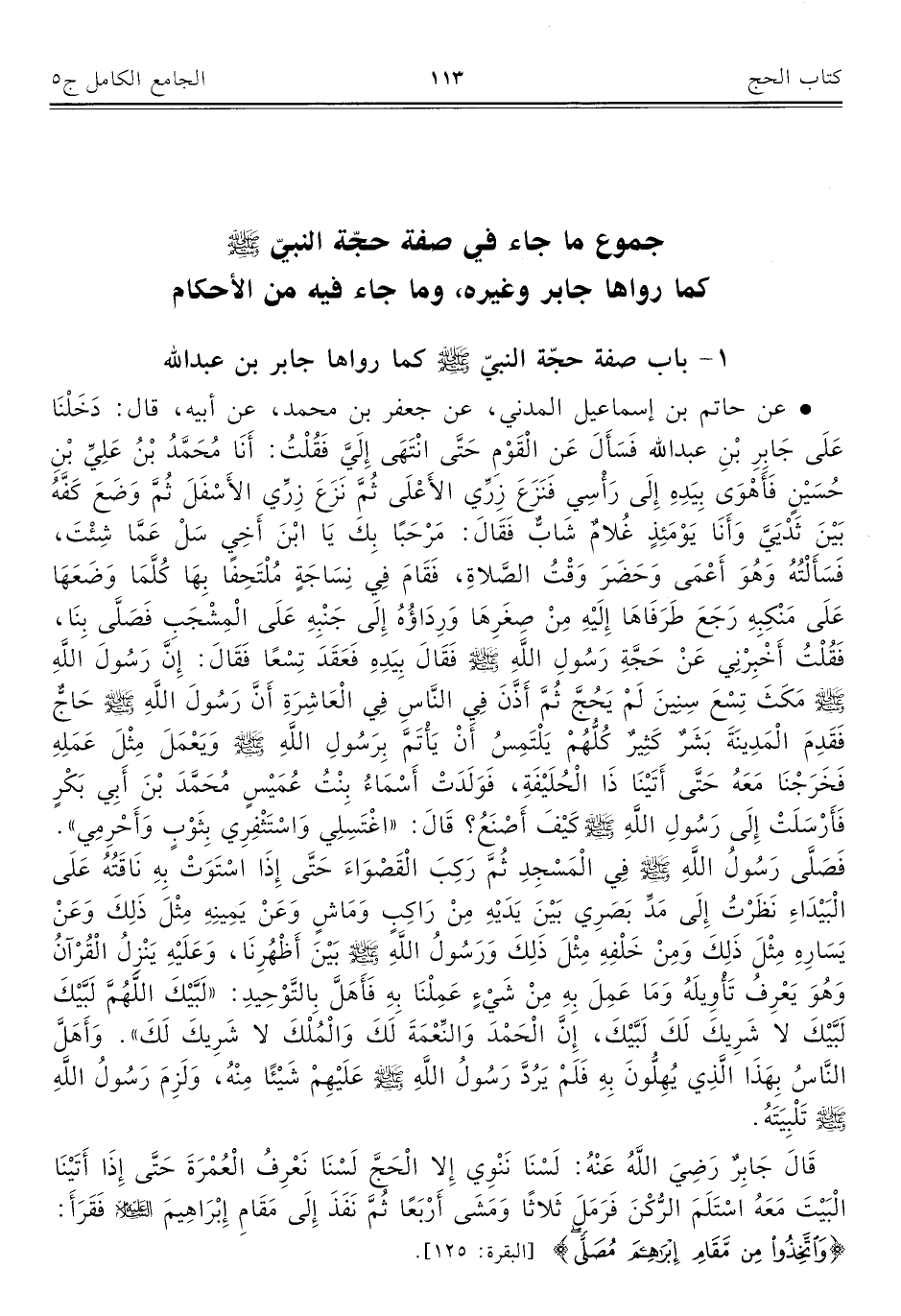 • عن حاتم بن إسماعيل المدني، عن جعفر بن محمد، عن أبيه، قال: دَخَلْنَا عَلَى جَابِرِ بْنِ عَبْدِ اللهِ، فَسَأَلَ عَنِ الْقَوْمِ حَتَّى انْتَهَى إِلَيَّ فَقُلْتُ: أَنَا مُحَمَّدُ بْنُ عَلِيِّ بْنِ حُسَيْنٍ، فَأَهْوَى بِيَدِهِ إِلَى رَأْسِي فَنَزَعَ زِرِّي الأَعْلَى ثُمَّ نَزَعَ زِرِّي الأَسْفَلَ ثُمَّ وَضَعَ كَفَّهُ بَيْنَ ثَدْيَيَّ وَأَنَا يَوْمَئِذٍ غُلَامٌ شَابٌّ، فَقَالَ: مَرْحَبًا بِكَ، يَا ابْنَ أَخِي، سَلْ عَمَّا شِئْتَ، فَسَأَلْتُهُ وَهُوَ أَعْمَى وَحَضَرَ وَقْتُ الصَّلَاةِ، فَقَامَ فِي نِسَاجَةٍ مُلْتَحِفًا بِهَا، كُلَّمَا وَضَعَهَا عَلَى مَنْكِبِهِ رَجَعَ طَرَفَاهَا إِلَيْهِ مِنْ صِغَرِهَا وَرِدَاؤُهُ إِلَى جَنْبِهِ عَلَى الْمِشْجَبِ فَصَلَّى بِنَا، فَقُلْتُ أَخْبِرْنِي عَنْ حَجَّةِ رَسُولِ اللهِ - صلى الله عليه وسلم - فَقَالَ بِيَدِهِ فَعَقَدَ تِسْعًا فَقَالَ: إِنَّ رَسُولَ اللهِ - صلى الله عليه وسلم - مَكَثَ تِسْعَ سِنِينَ لَمْ يَحُجَّ، ثُمَّ أَذَّنَ فِي النَّاسِ فِي الْعَاشِرَةِ أَنَّ رَسُولَ اللهِ - صلى الله عليه وسلم - حَاجٌّ فَقَدِمَ الْمَدِينَةَ بَشَرٌ كَثِيرٌ كُلُّهُمْ يَلْتَمِسُ أَنْ يَأْتَمَّ بِرَسُولِ اللهِ - صلى الله عليه وسلم - وَيَعْمَلَ مِثْلَ عَمَلِهِ فَخَرَجْنَا مَعَهُ حَتَّى أَتَيْنَا ذَا الْحُلَيْفَةِ، فَوَلَدَتْ أَسْمَاءُ بِنْتُ عُمَيْسٍ مُحَمَّدَ بْنَ أَبِي بَكْرٍ فَأَرْسَلَتْ إِلَى رَسُولِ اللهِ - صلى الله عليه وسلم - كَيْفَ أَصْنَعُ؟ قَالَ: "اغْتَسِلِي، وَاسْتَثْفِرِي بِثَوْبٍ وَأَحْرِمِي". فَصَلَّى رَسُولُ اللهِ - صلى الله عليه وسلم - فِي الْمَسْجِدِ ثُمَّ رَكِبَ الْقَصْوَاءَ حَتَّى إِذَا اسْتَوَتْ بِهِ نَاقَتُهُ عَلَى الْبَيْدَاءِ، نَظَرْتُ إِلَى مَدِّ بَصَرِي بَيْنَ يَدَيْهِ مِنْ رَاكِبٍ وَمَاشٍ وَعَنْ يَمِينِهِ مِثْلَ ذَلِكَ وَعَنْ يَسَارِهِ مِثْلَ ذَلِكَ وَمِنْ خَلْفِهِ مِثْلَ ذَلِكَ وَرَسُولُ اللهِ - صلى الله عليه وسلم - بَيْنَ أَظْهُرِنَا، وَعَلَيْهِ يَنْزِلُ الْقُرْآنُ وَهُوَ يَعْرِفُ تَأْوِيلَهُ وَمَا عَمِلَ بِهِ مِنْ شَيْءٍ عَمِلْنَا بِهِ فَأَهَلَّ بِالتَّوْحِيدِ: "لَبَّيْكَ اللَّهُمَّ، لَبَّيْكَ لَبَّيْكَ لا شَرِيكَ لَكَ لَبَّيْكَ، إِنَّ الْحَمْدَ وَالنِّعْمَةَ لَكَ، وَالْمُلْكَ لا شَرِيكَ لَكَ" وَأَهَلَّ النَّاسُ بِهَذَا الَّذِي يُهِلُّونَ بِهِ فَلَمْ يَرُدَّ رَسُولُ اللهِ - صلى الله عليه وسلم - عَلَيْهِمْ شَيْئًا مِنْهُ، وَلَزِمَ رَسُولُ اللهِ - صلى الله عليه وسلم - تَلْبِيَتَهُ.