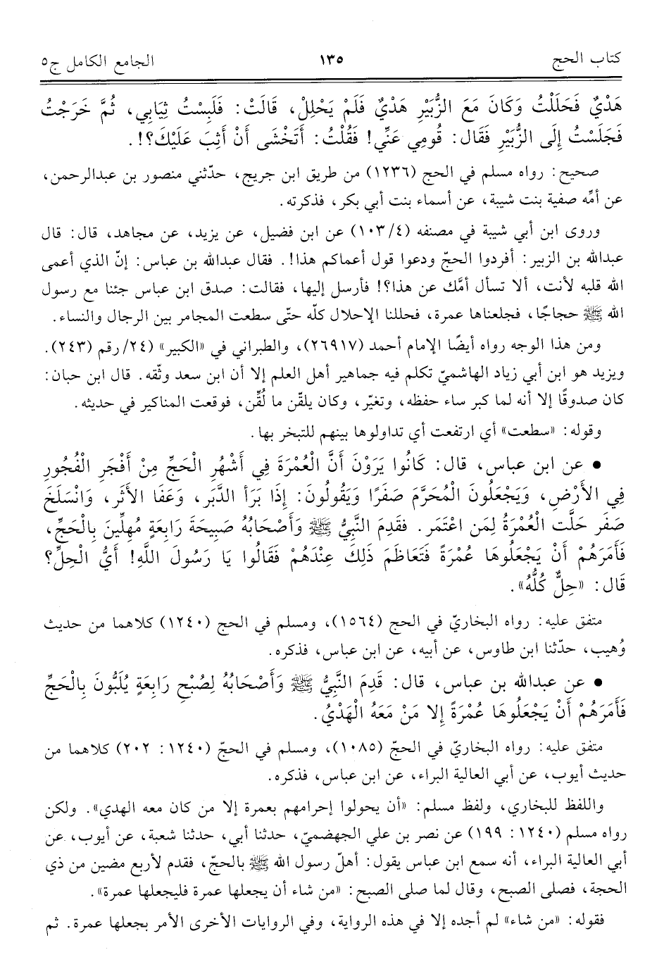 • عن عبد الله بن عباس، قال: قَدِمَ النَّبِيُّ - صلى الله عليه وسلم - وَأَصْحَابُهُ لِصُبْحِ رَابِعَةٍ يُلَبُّونَ بِالْحَجِّ فَأَمَرَهُمْ أَنْ يَجْعَلُوهَا عُمْرَةً إِلا مَنْ مَعَهُ الْهَدْيُ.