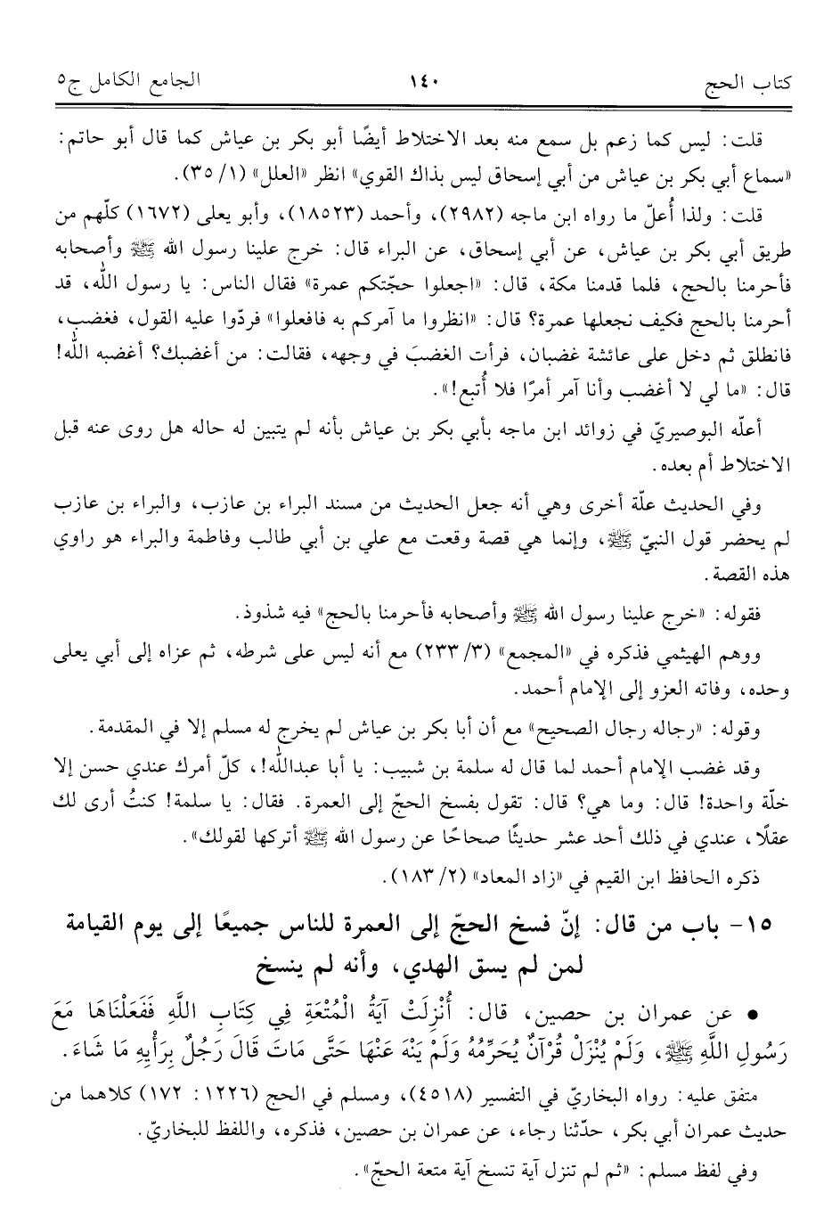 وقوله: "رجاله رجال الصحيح" مع أن أبا بكر بن عياش لم يخرج له مسلم إلا في المقدمة. وقد غضب الإمام أحمد لما قال له سلمة بن شبيب: يا أبا عبد الله! ، كلّ أمرك عندي حسن إلا خلّة واحدة! قال: وما هي؟ قال: تقول بفسخ الحجّ إلى العمرة. فقال: يا سلمة! كنتُ أرى لك عقلًا، عندي في ذلك أحد عشر حديثًا صحاحًا عن رسول الله - صلى الله عليه وسلم - أتركها لقولك".