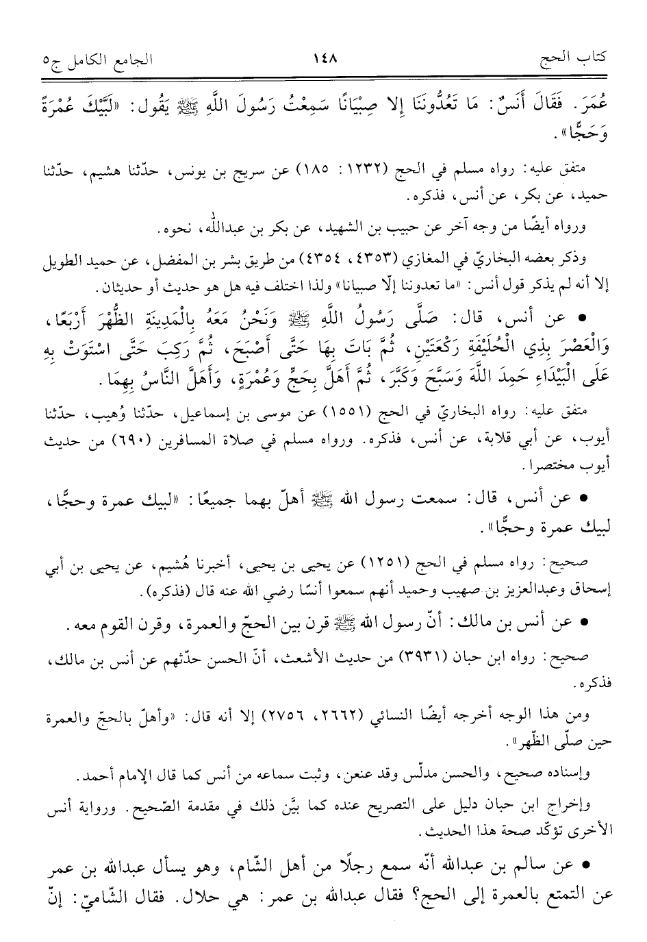 • عن أنس بن مالك: أنّ رسول الله - صلى الله عليه وسلم - قرن بين الحجّ والعمرة، وقرن القوم معه.