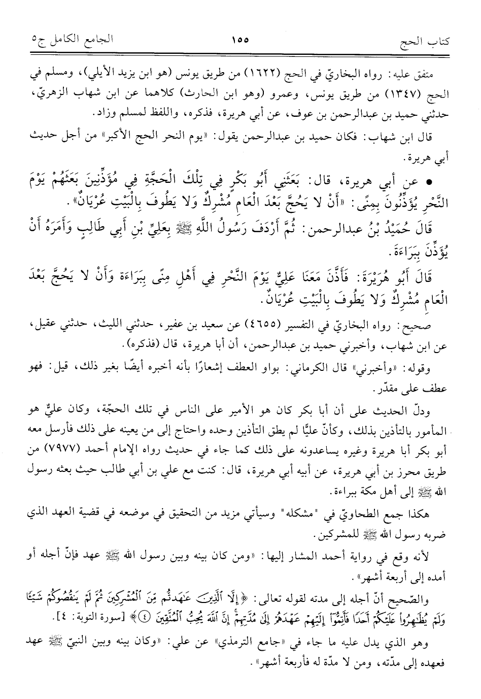 • عن أبي هريرة، قال: بَعَثَنِي أَبُو بَكْرٍ فِي تِلْكَ الْحَجَّةِ فِي مُؤَذِّنِينَ بَعَثَهُمْ يَوْمَ النَّحْرِ يُؤَذِّنُونَ بِمِنًى: "أَنْ لَا يَحُجُّ بَعْدَ الْعَامِ مُشْرِكٌ وَلَا يَطُوفُ بِالْبَيْتِ عُرْيَانٌ".