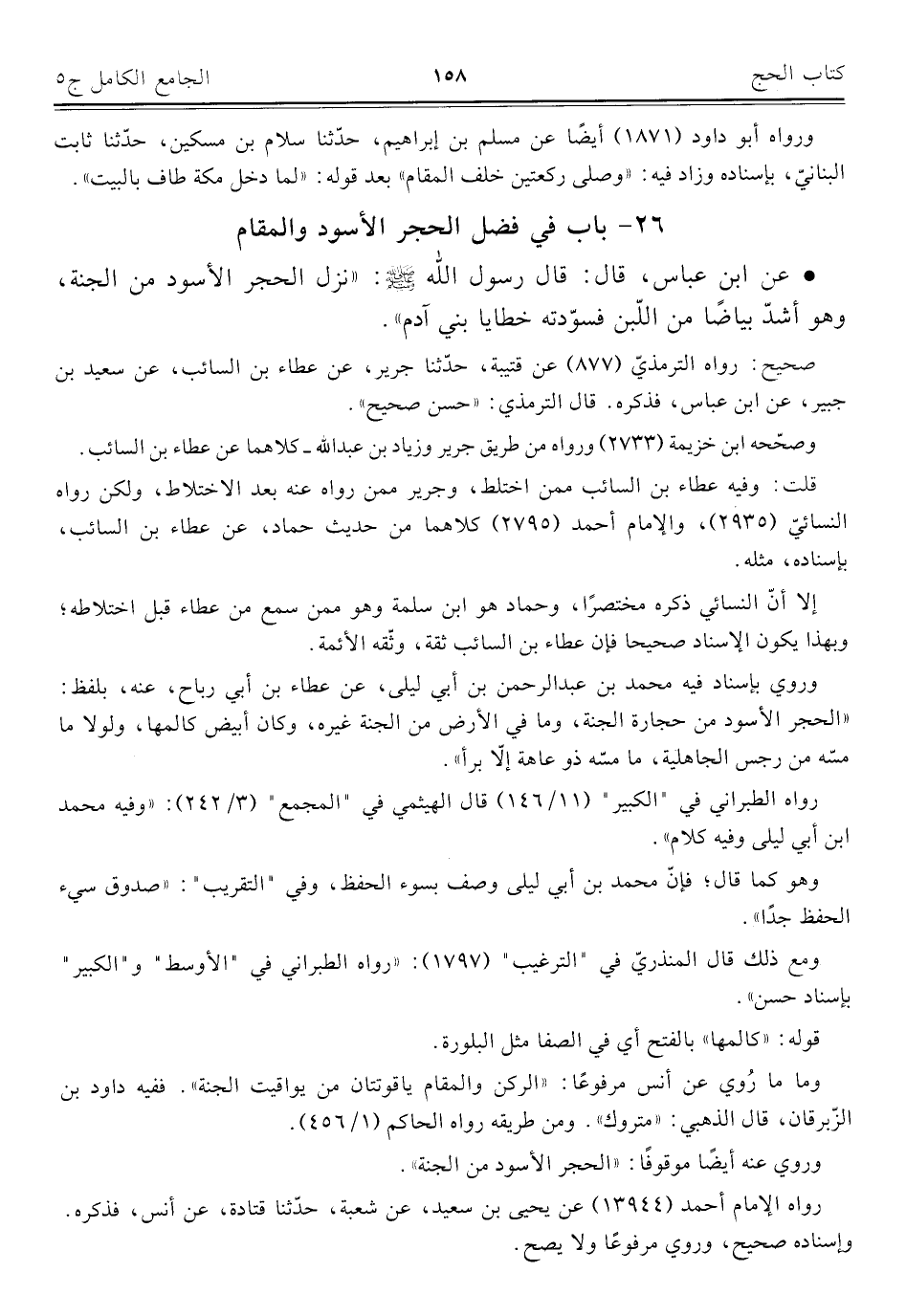 وروي بإسناد فيه محمد بن عبد الرحمن بن أبي ليلى، عن عطاء بن أبي رباح، عنه، بلفظ: "الحجر الأسود من حجارة الجنة، وما في الأرض من الجنة غيره، وكان أبيض كالمها، ولولا ما مسّه من رجس الجاهلية، ما مسّه ذو عاهة إلّا برأ".