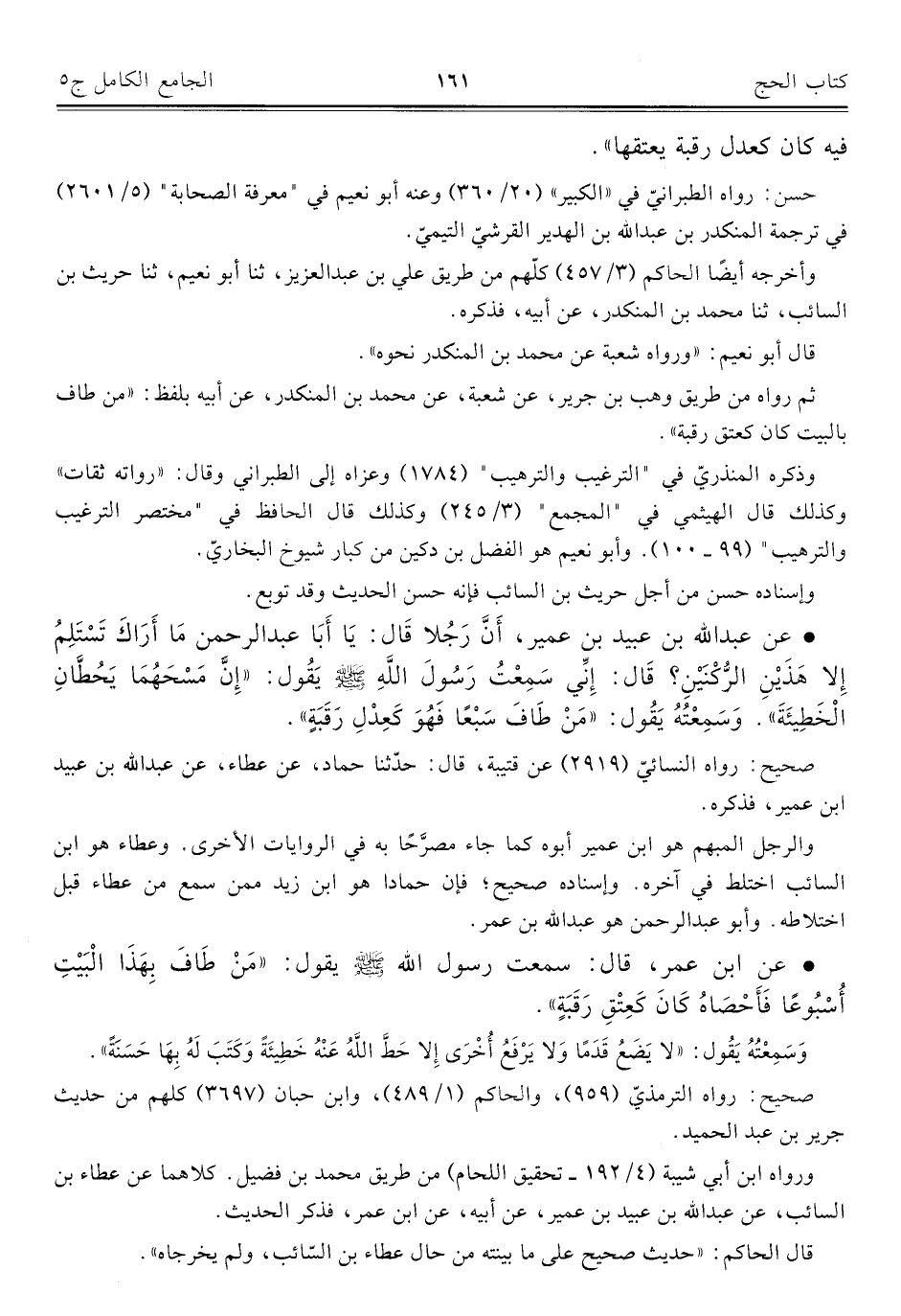 • عن ابن عمر، قال: سمعت رسول الله - صلى الله عليه وسلم - يقول: "مَنْ طَافَ بِهَذَا الْبَيْتِ أُسْبُوعًا فَأَحْصَاهُ كَانَ كَعِتْقِ رَقَبَةٍ".