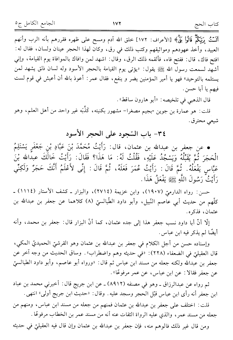 • عن جعفر بن عبد الله بن عثمان، قال: رَأَيْتُ مُحَمَّدَ بْنَ عَبَّادَ بْنِ جَعْفَرٍ يَسْتَلِمُ الْحَجَرَ ثُمَّ يُقَبِّلُهُ وَيَسْجُدُ عَلَيْهِ، فَقُلْتُ لَهُ: مَا هَذَا؟ فَقَالَ: رَأَيْتُ خَالَكَ عبد الله بْنَ عَبَّاسٍ يَفْعَلُهُ. ثُمَّ قَالَ: رَأَيْتُ عُمَرَ فَعَلَهُ، ثُمَّ قَالَ: إِنِّى لأَعْلَمُ أَنَّكَ حَجَرٌ وَلَكِنِّي رَأَيْتُ رَسُولَ اللهِ - صلى الله عليه وسلم - يَفْعَلُ هَذَا.