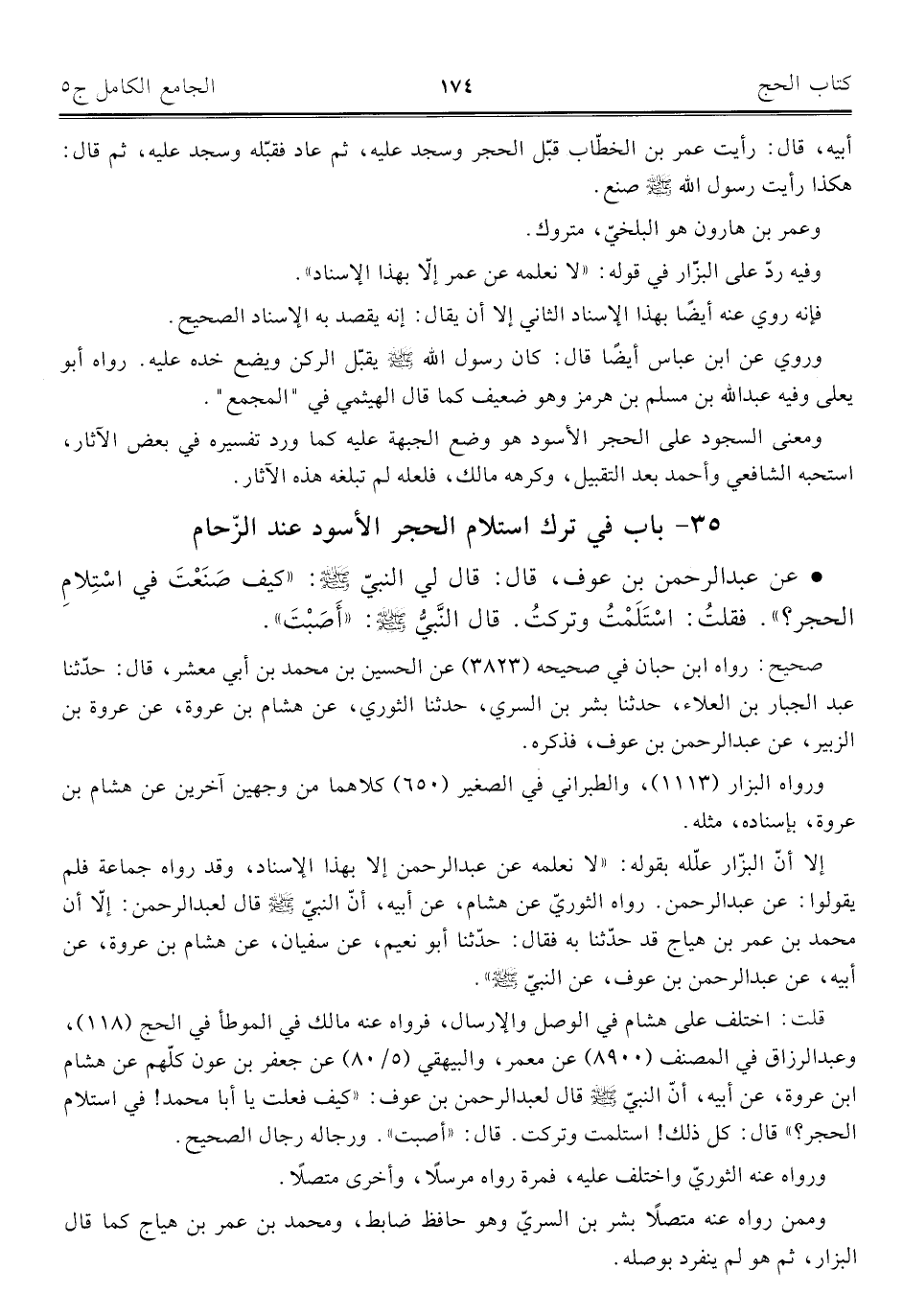 • عن عبد الرحمن بن عوف، قال: قال لي النبيّ - صلى الله عليه وسلم -: "كيف صَنَعْتَ في اسْتِلامِ الحجر؟ ". فقلتُ: اسْتَلَمْتُ وتركتُ. قال النَّبيُّ - صلى الله عليه وسلم -: "أَصَبْتَ".