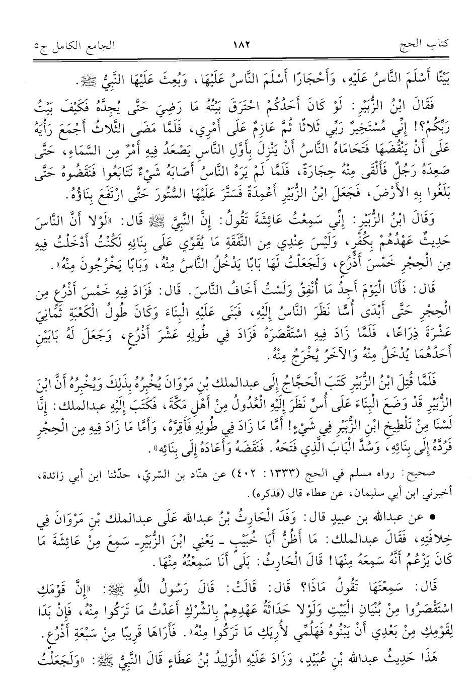 فَلَمَّا قُتِلَ ابْنُ الزُّبَيْرِ كَتَبَ الْحَجَّاجُ إِلَى عبد الملك بْنِ مَرْوَانَ يُخْبِرُهُ بِذَلِكَ وَيُخْبِرُهُ أَنَّ ابْنَ الزُّبَيْرَ قَدْ وَضَعَ الْبِنَاءَ عَلَى أُسٍّ نَظَرَ إِلَيْهِ الْعُدُولُ مِنْ أَهْلِ مَكَّةَ، فَكَتَبَ إِلَيْهِ عبد الملك: إِنَّا لَسْنَا مِنْ تَلْطِيخِ ابْنِ الزُّبَيْرِ فِي شَيْءٍ! أَمَّا مَا زَادَ فِي طُولِهِ فَأَقِرَّهُ، وَأَمَّا مَا زَادَ فِيهِ مِن الْحِجْرِ فَرُدَّهُ إِلَى بِنَائِهِ، وَسُدَّ الْبَابَ الَّذِي فَتَحَهُ. فَنَقَضَهُ وَأَعَادَهُ إِلَى بِنَائِه".