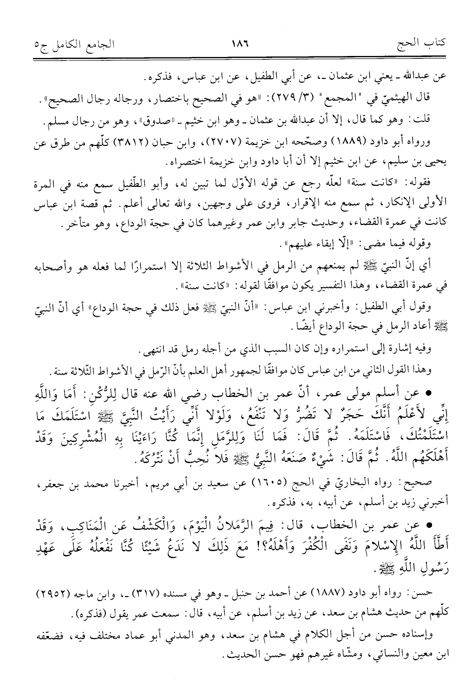 • عن عمر بن الخطاب، قال: فِيمَ الرَّمَلانُ الْيَوْمَ، وَالْكَشْفُ عَن الْمَنَاكِبِ، وَقَدْ أَطَّأَ الله الإِسْلامَ وَنَفَى الْكُفْرَ وَأَهْلَهُ؟ ! مَعَ ذَلِكَ لا نَدَعُ شَيْئًا كُنَّا نَفْعَلُهُ عَلَى عَهْدِ رَسُولِ الله - صلى الله عليه وسلم -.