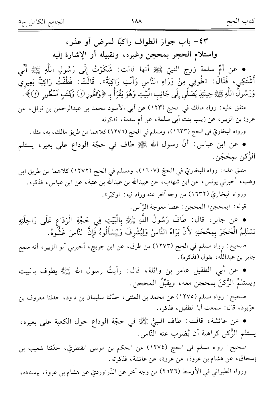 ٤٣ - باب جواز الطواف راكبًا لمرض أو عذر، واستلام الحجر بمحجن وغيره، وتقبيله أو الإشارة إليه