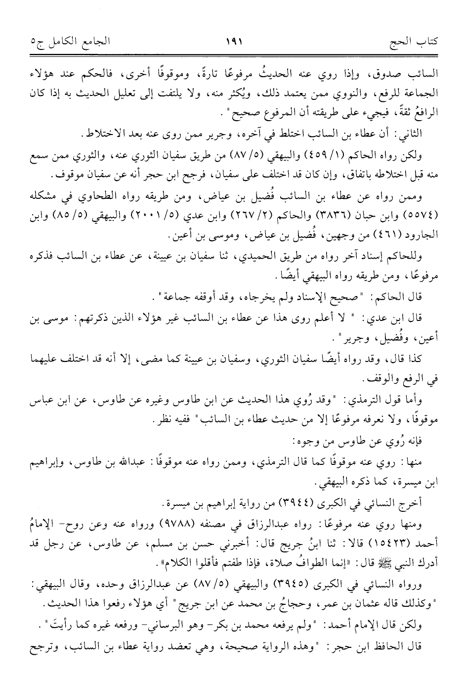السائب صدوق، وإذا روي عنه الحديثُ مرفوعًا تارةً، وموقوفًا أخرى، فالحكم عند هؤلاء الجماعة للرفع، والنووي ممن يعتمد ذلك، ويُكثر منه، ولا يلتفت إلى تعليل الحديث به إذا كان الرافعُ ثقةً، فيجيء على طريقته أن المرفوع صحيح".