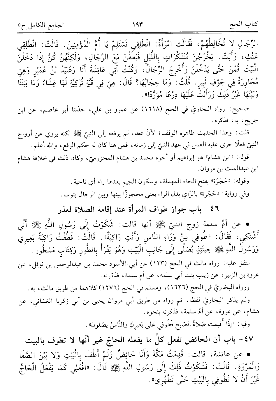 • عن عائشة، قالت: قَدِمْتُ مَكَّةَ وَأَنَا حَائِضٌ وَلَمْ أَطُفْ بِالْبَيْتِ وَلا بَيْنَ الصَّفَا وَالْمَرْوَةِ. قَالَتْ: فَشَكَوْتُ ذَلِكَ إِلَى رَسُولِ الله - صلى الله عليه وسلم - قَالَ: "افْعَلِي كَمَا يَفْعَلُ الْحَاجُّ غَيْرَ أَنْ لا تَطُوفِي بِالْبَيْتِ حَتَّى تَطْهُرِي".