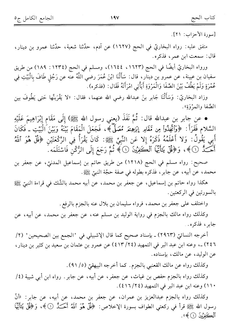 وكذلك رواه بالجزم عبد العزيز بن عمران، عن جعفر بن محمد، عن أبيه، عن جابر: "أنّ رسول الله - صلى الله عليه وسلم - قرأ في ركعتي الطواف بسورة الإخلاص: {قُلْ هُوَ اللَّهُ أَحَدٌ (١)}، {قُلْ يَاأَيُّهَا الْكَافِرُونَ (١)} ".