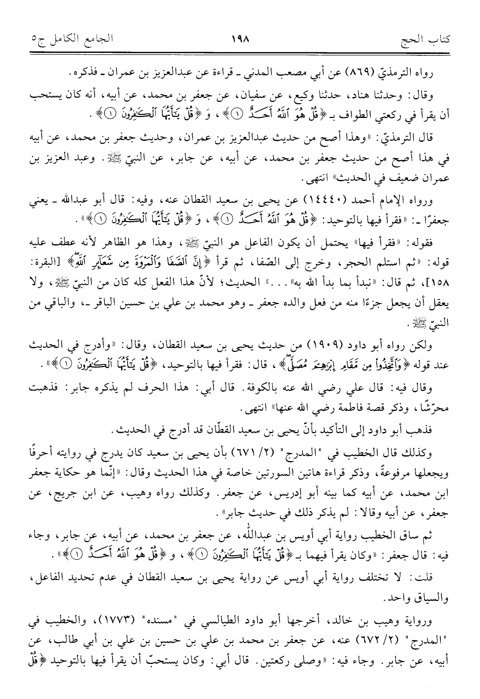 وكذلك قال الخطيب في "المدرج" (٢/ ٦٧١) بأن يحيى بن سعيد كان يدرج في روايته أحرفًا ويجعلها مرفوعةً، وذكر قراءة هاتين السورتين خاصة في هذا الحديث وقال: "إنّما هو حكاية جعفر ابن محمد، عن أبيه كما بينه أبو إدريس، عن جعفر. وكذلك رواه وهيب، عن ابن جريج، عن جعفر، عن أبيه وقالا: لم يذكر ذلك في حديث جابر".