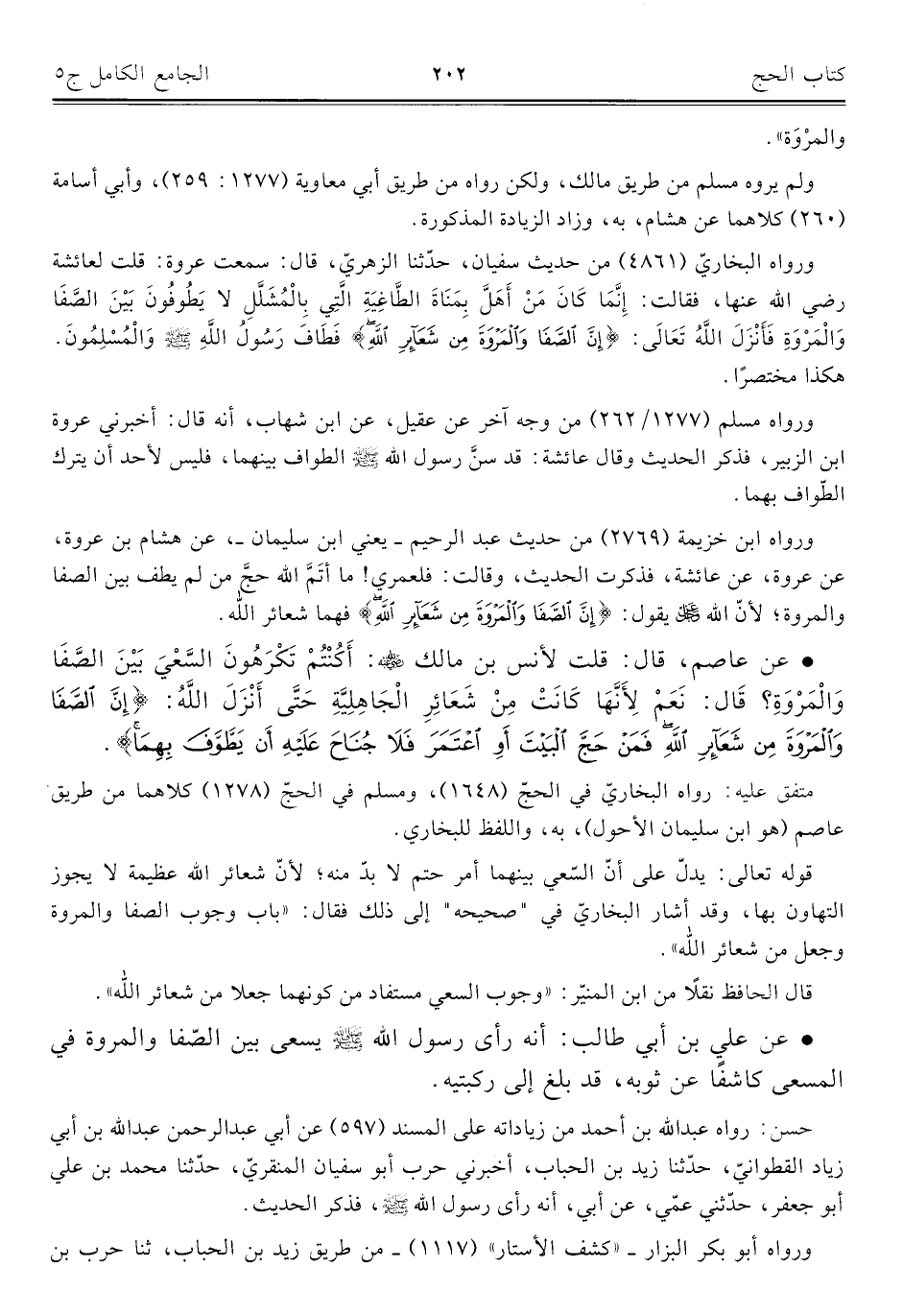 ورواه ابن خزيمة (٢٧٦٩) من حديث عبد الرحيم -يعني ابن سليمان-، عن هشام بن عروة، عن عروة، عن عائشة، فذكرت الحديث، وقالت: فلعمري! ما أتَمَّ الله حجَّ من لم يطف بين الصفا والمروة؛ لأنّ الله عز وجل يقول: {إِنَّ الصَّفَا وَالْمَرْوَةَ مِنْ شَعَائِرِ اللَّهِ} فهما شعائر الله.