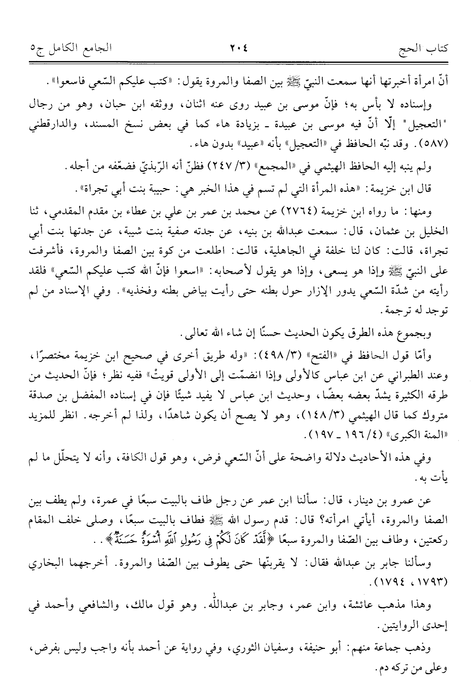 ومنها: ما رواه ابن خزيمة (٢٧٦٤) عن محمد بن عمر بن علي بن عطاء بن مقدم المقدمي، ثنا الخليل بن عثمان، قال: سمعت عبد الله بن بنيه، عن جدته صفية بنت شيبة، عن جدتها بنت أبي تجراة، قالت: كان لنا خلفة في الجاهلية، قالت: اطلعت من كوة بين الصفا والمروة، فأشرفت على النبيّ - صلى الله عليه وسلم - وإذا هو يسعى، وإذا هو يقول لأصحابه: "اسعوا فإنّ الله كتب عليكم السّعي" فلقد رأيته من شدّة السّعي يدور الإزار حول بطنه حتى رأيت بياض بطنه وفخذيه". وفي الإسناد من لم توجد له ترجمة.