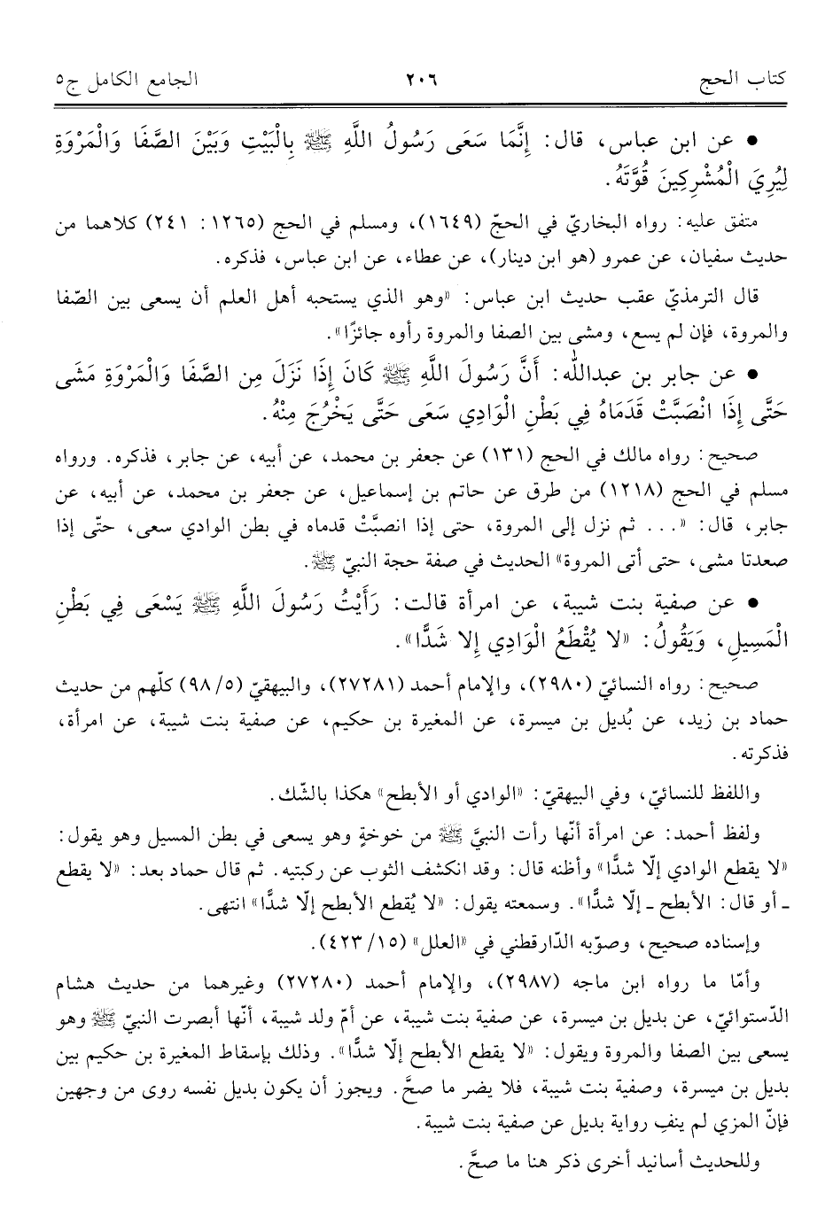 • عن جابر بن عبد الله: أَنَّ رَسُولَ اللهِ - صلى الله عليه وسلم - كَانَ إِذَا نَزَلَ مِن الصَّفَا وَالْمَرْوَةِ مَشَي حَتَّى إِذَا انْصَبَّتْ قَدَمَاهُ فِي بَطْنِ الْوَادِي سَعَى حَتَّى يَخْرُجَ مِنْهُ.