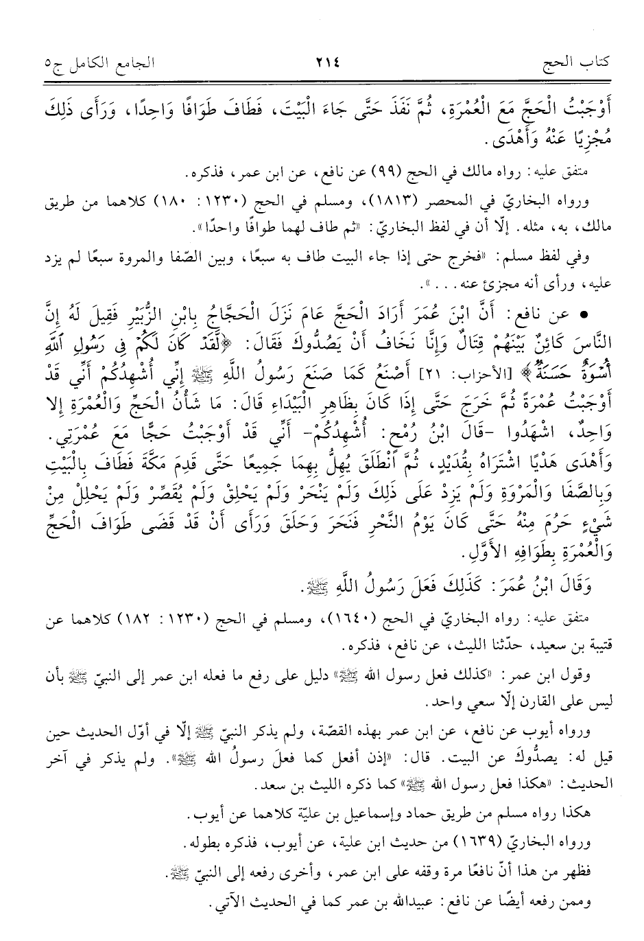 • عن نافع: أَنَّ ابْنَ عُمَرَ أَرَادَ الْحَجَّ عَامَ نَزَلَ الْحَجَّاجُ بِابْنِ الزُّبَيْرِ فَقِيلَ لَهُ إِنَّ النَّاسَ كَائِنٌ بَيْنَهُمْ قِتَالٌ وِإِنَّا نَخَافُ أَنْ يَصُدُّوكَ فَقَالَ: {لَقَدْ كَانَ لَكُمْ فِي رَسُولِ اللَّهِ أُسْوَةٌ حَسَنَةٌ} [الأحزاب: ٢١] أَصْنَعُ كَمَا صَنَعَ رَسُولُ الله - صلى الله عليه وسلم - إِنِّي أُشْهِدُكُمْ أَنِّي قَدْ أَوْجَبْتُ عُمْرَةً ثُمَّ خَرَجَ حَتَّى إِذَا كَانَ بِظَاهِرِ البَيْدَاءِ قَالَ: مَا شَأْنُ الْحَجِّ وَالْعُمْرَةِ إِلا وَاحِدٌ، اشْهَدُوا -قَالَ ابْنُ رُمْحٍ: أُشْهِدُكُمْ- أَنِّي قَدْ أَوْجَبْتُ حَجًّا مَعَ عُمْرَتِي. وَأَهْدَي هَدْيًا اشْتَرَاهُ بِقُدَيْدٍ، ثُمَّ انْطَلَقَ يُهِلُّ بِهِمَا جَمِيعًا حَتَّى قَدِمَ مَكَّةَ فَطَافَ بِالْبَيْتِ وَبِالصَّفَا وَالْمَرْوَةِ وَلَمْ يَزِدْ عَلَى ذَلِكَ وَلَمْ يَنْحَرْ وَلَمْ يَحْلِقْ وَلَمْ يُقَصِّرْ وَلَمْ يَحْلِلْ مِنْ شَيْءٍ حَرُمَ مِنْهُ حَتَّى كَانَ يَوْمُ النَّحْرِ فَنَحَرَ وَحَلَقَ وَرَأَى أَنْ قَدْ قَضَى طَوَافَ الْحَجِّ وَالْعُمْرَةِ بِطَوَافِهِ الأَوَّلِ.
