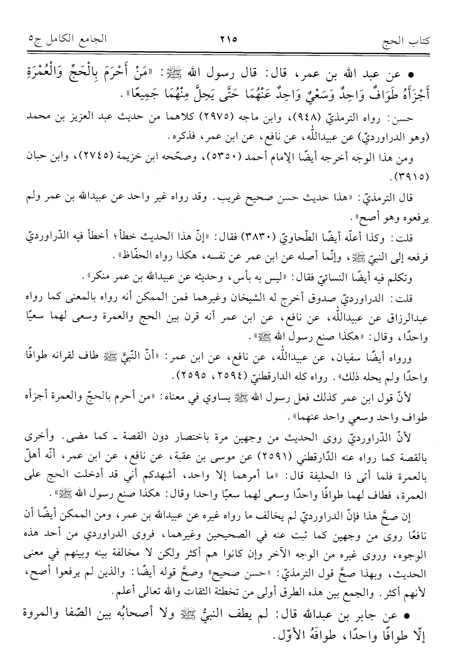 • عن عبد الله بن عمر، قال: قال رسول الله - صلى الله عليه وسلم -: "مَنْ أَحْرَمَ بِالْحَجِّ وَالْعُمْرَةِ أَجْزَأَهُ طَوَافٌ وَاحِدٌ وَسَعْيٌ وَاحِدٌ عَنْهُمَا حَتَّى يَحِلَّ مِنْهُمَا جَمِيعًا".